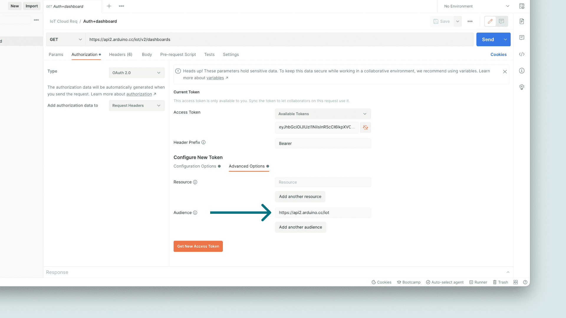 https://api2.arduino.cc/iot to the "Audience" field.Finally, click on the "Get New Access Token".