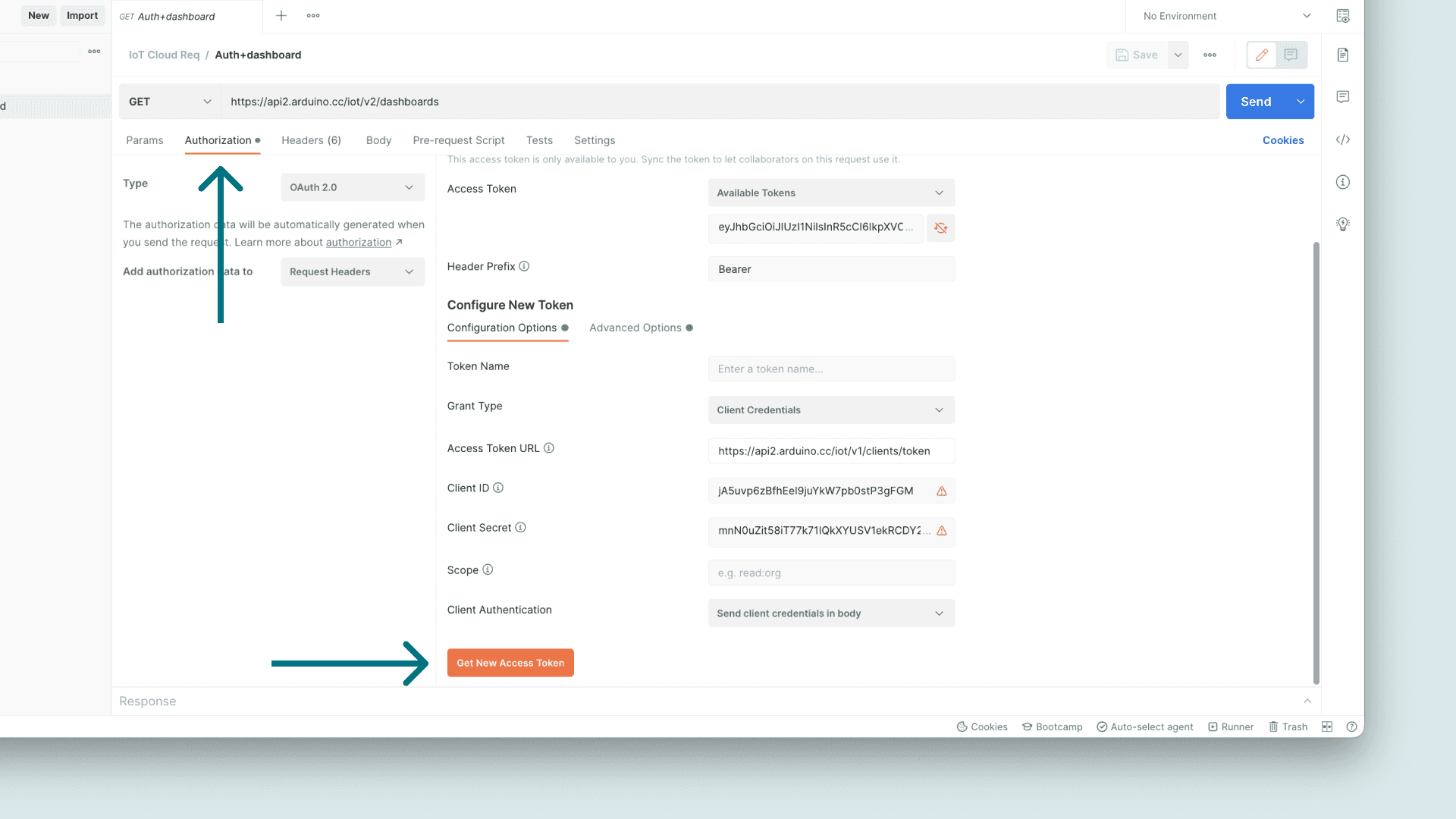 4async function getToken() {5 var options = {6 method: 'POST',7 url: 'https://api2.arduino.cc/iot/v1/clients/token',8 headers: { 'content-type': 'application/x-www-form-urlencoded' },9 json: true,10 form: {11 grant_type: 'client_credentials',12 client_id: 'YOUR_CLIENT_ID',13 client_secret: 'YOUR_CLIENT_SECRET',14 audience: 'https://api2.arduino.cc/iot'15 }16 };17