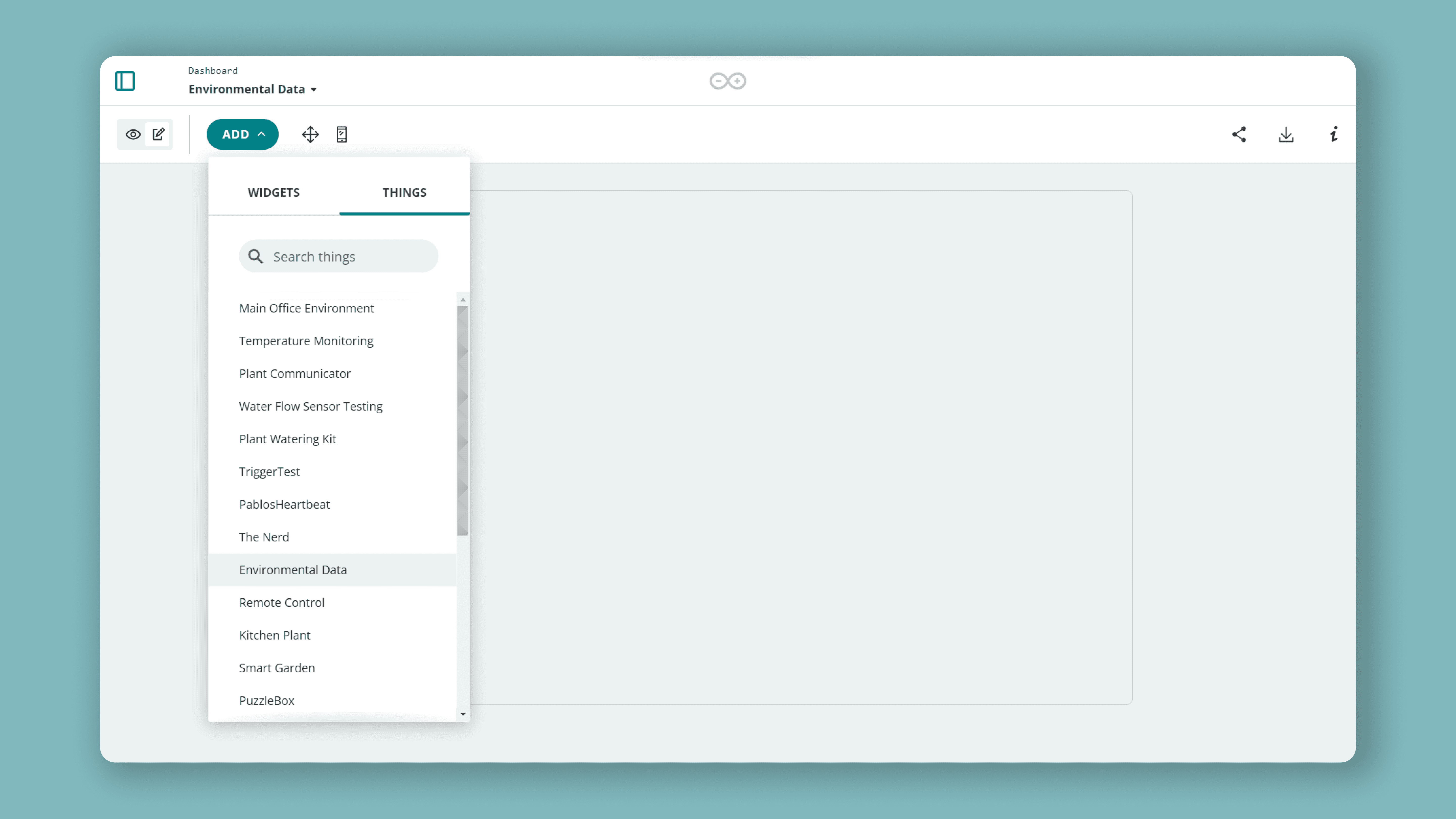 Simply click on the "Add" button, and a dropdown menu will appear. Here we will click on "Things", and select the Thing that appears here.
