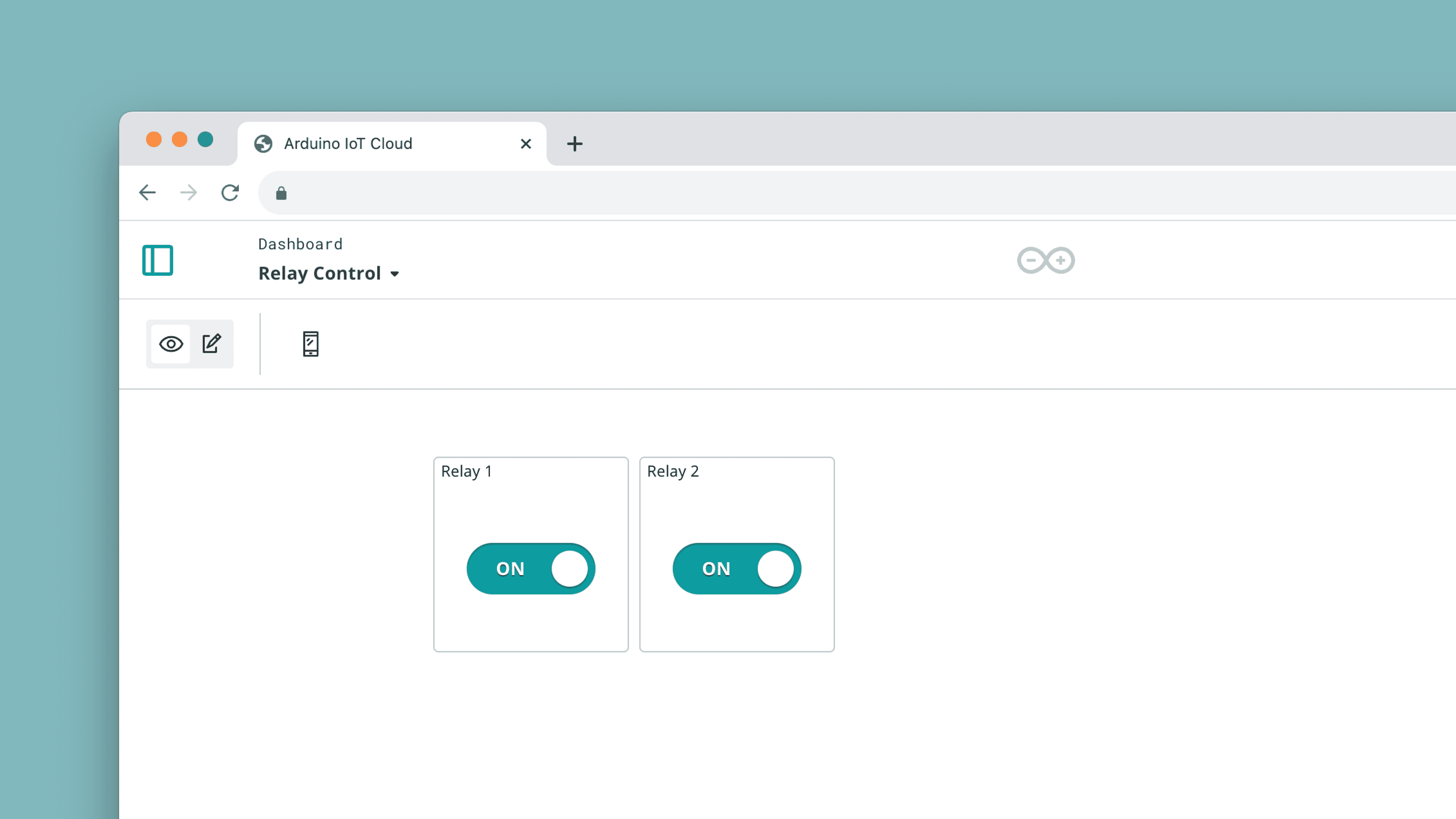 relay_x variable that we created earlier. These switches will be directly linked with your Arduino MKR WiFi 1010's variables, and will turn ON/OFF the relays on your board.You can also access your dashboard via the Arduino IoT Remote app.