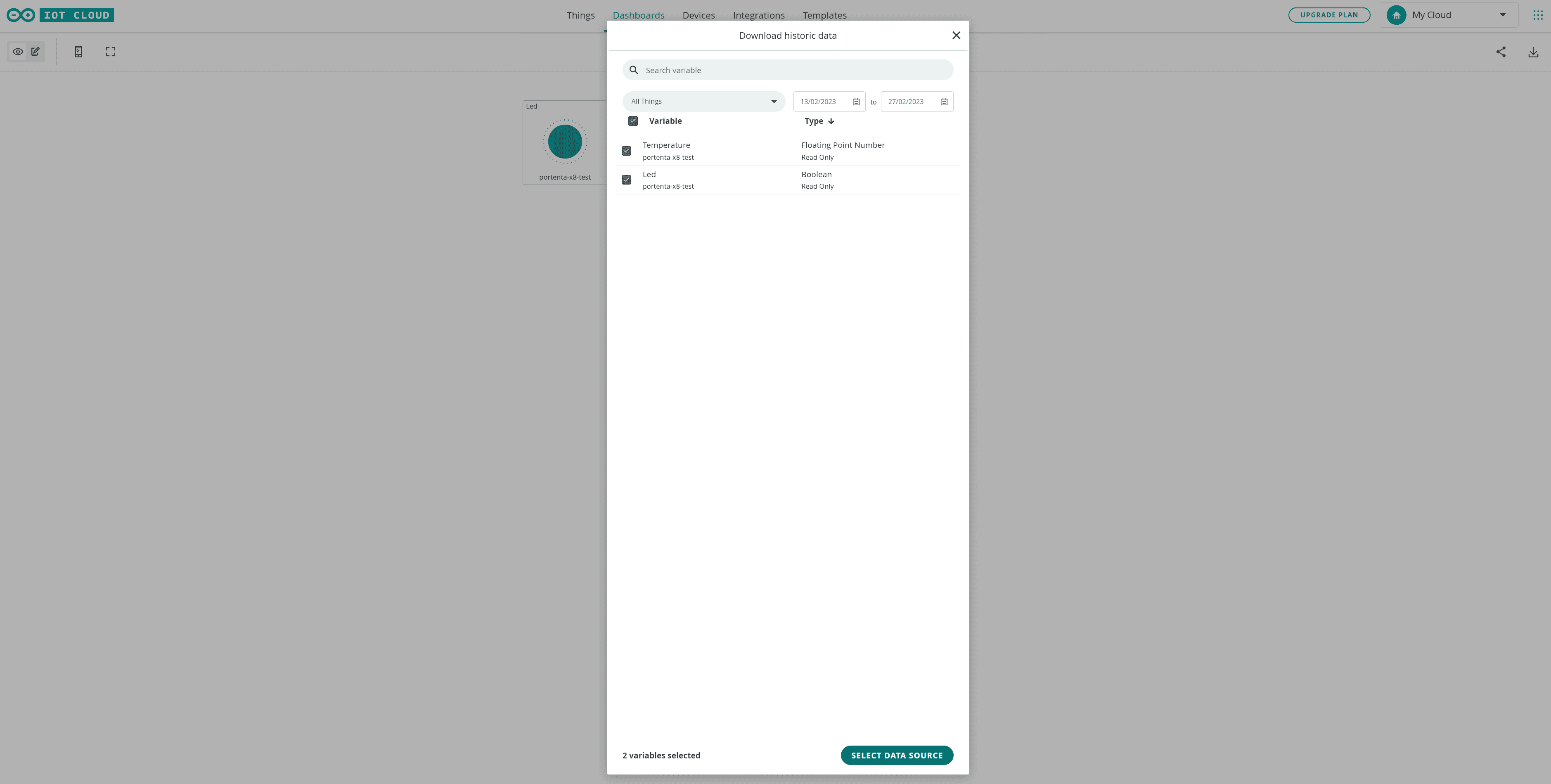 To start exporting your data locally, navigate into one of your dashboards on the Arduino Cloud. While inside a dashboard, press the Download icon in the upper right corner. This will open a new window that will allow you to select which historical data you would like to download.