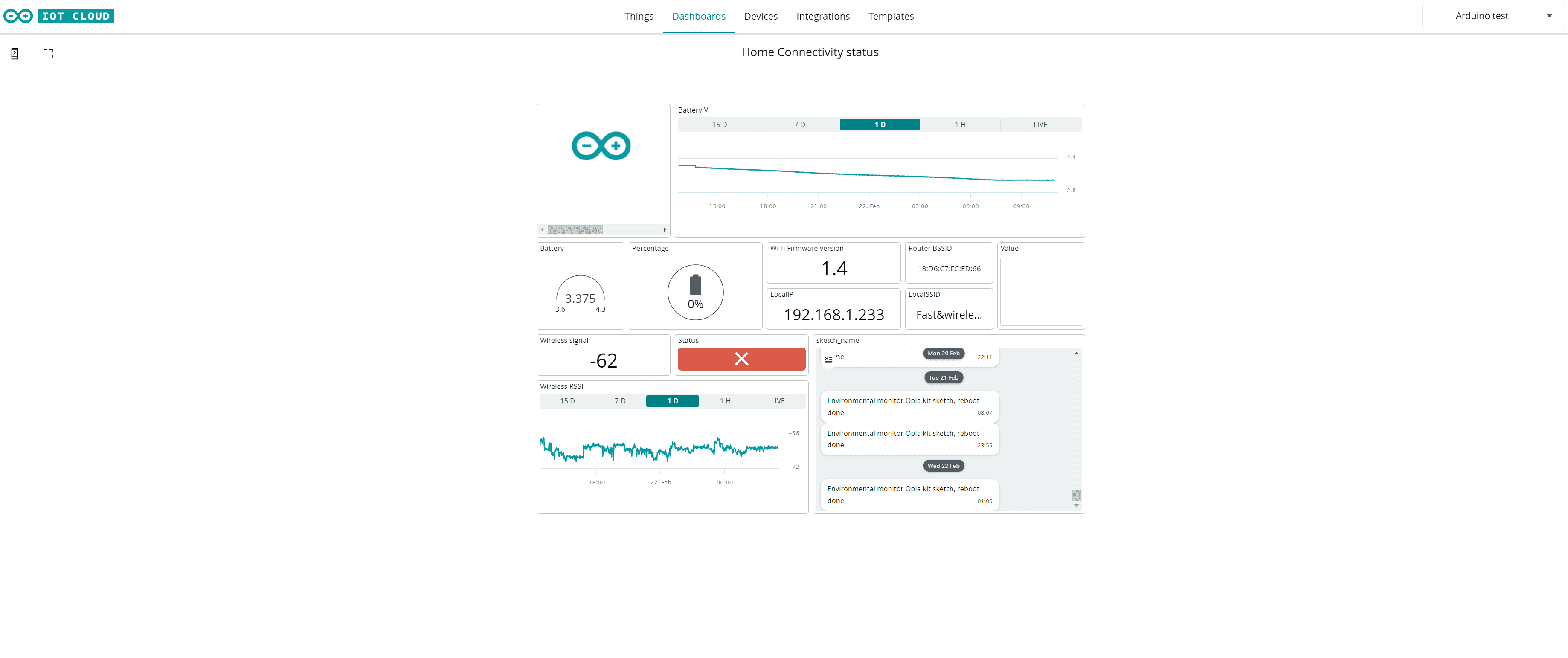 You can now check its status under the Devices section. This section displays the name, status, and linked Things for each of the configured devices. Clicking on the device allows for renaming it, as well as accessing more information about the device, such as its ID number, type, FQBN, serial number, firmware version, linked Thing, latest activity, and the date when the device was added.