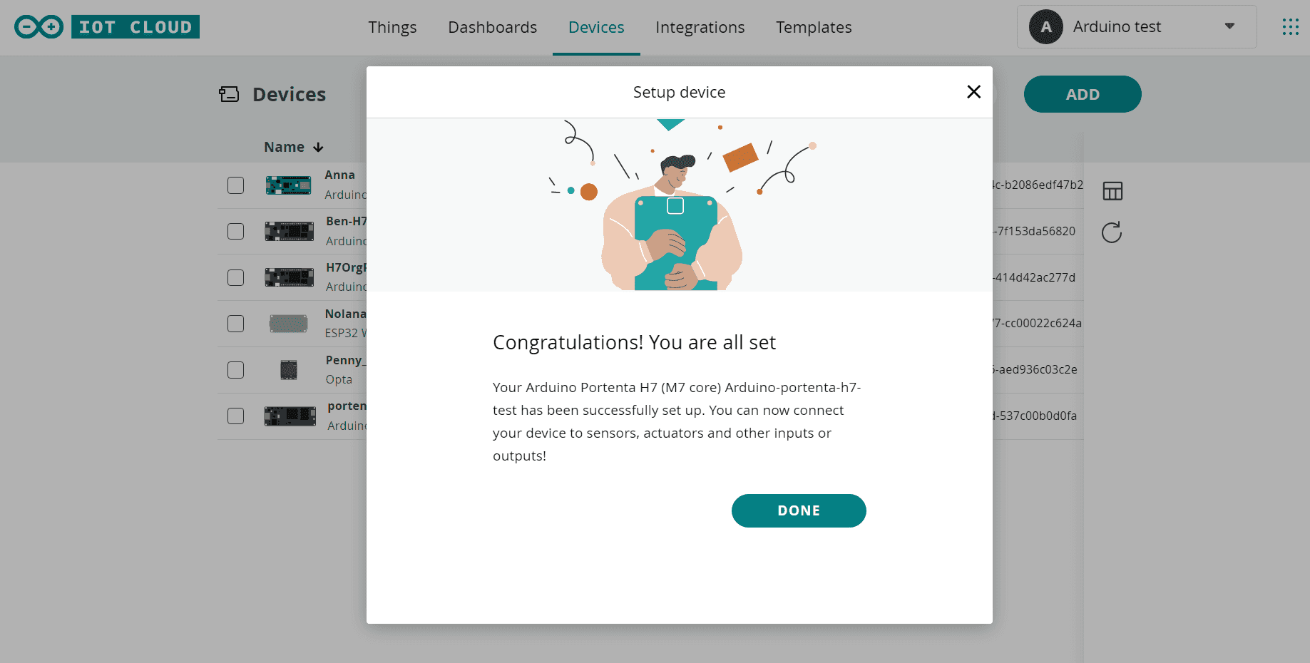 If the onboarding proceeds as expected, the following page will appear confirming that your device has been successfully provisioned in Arduino Cloud.
