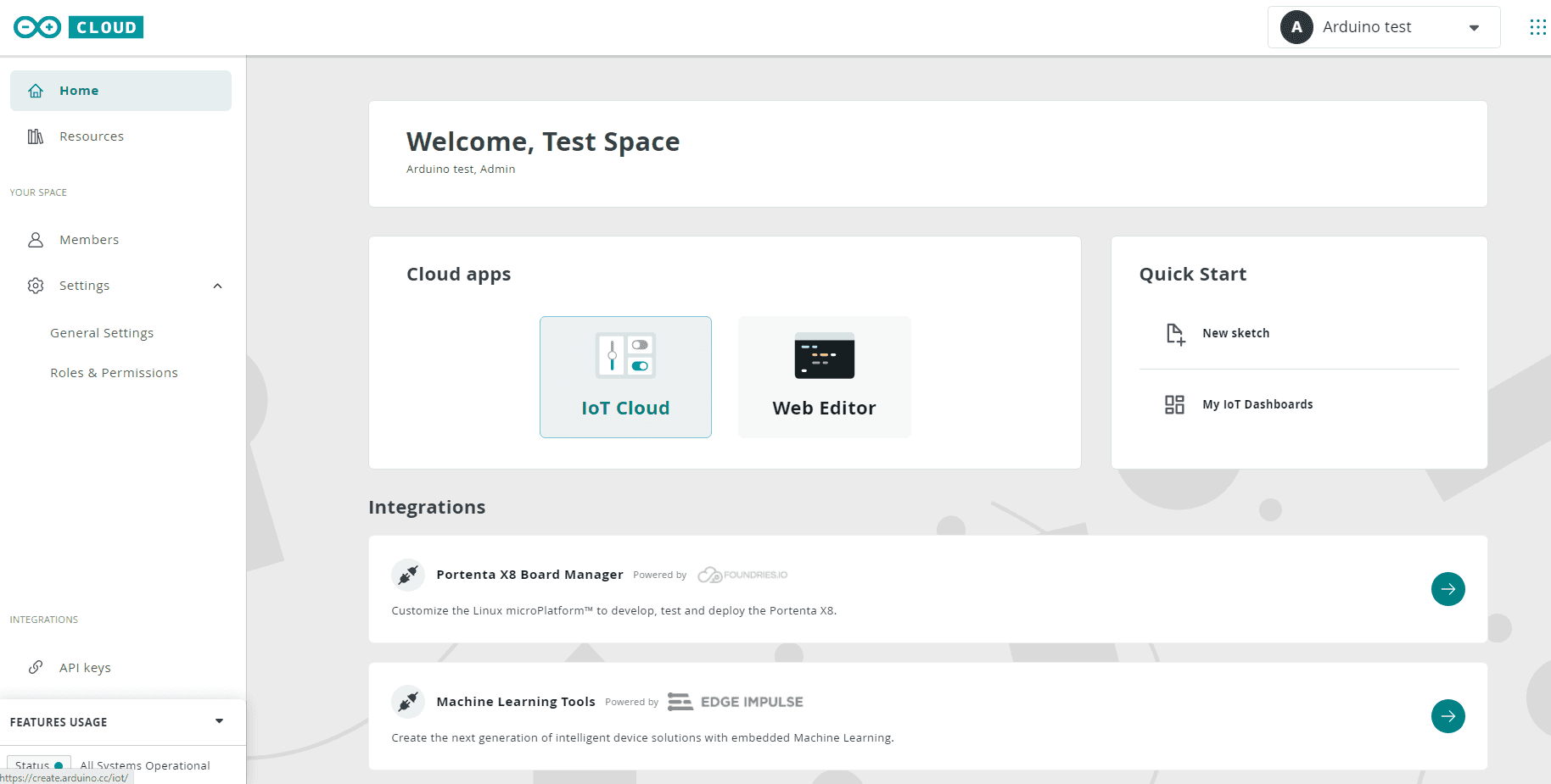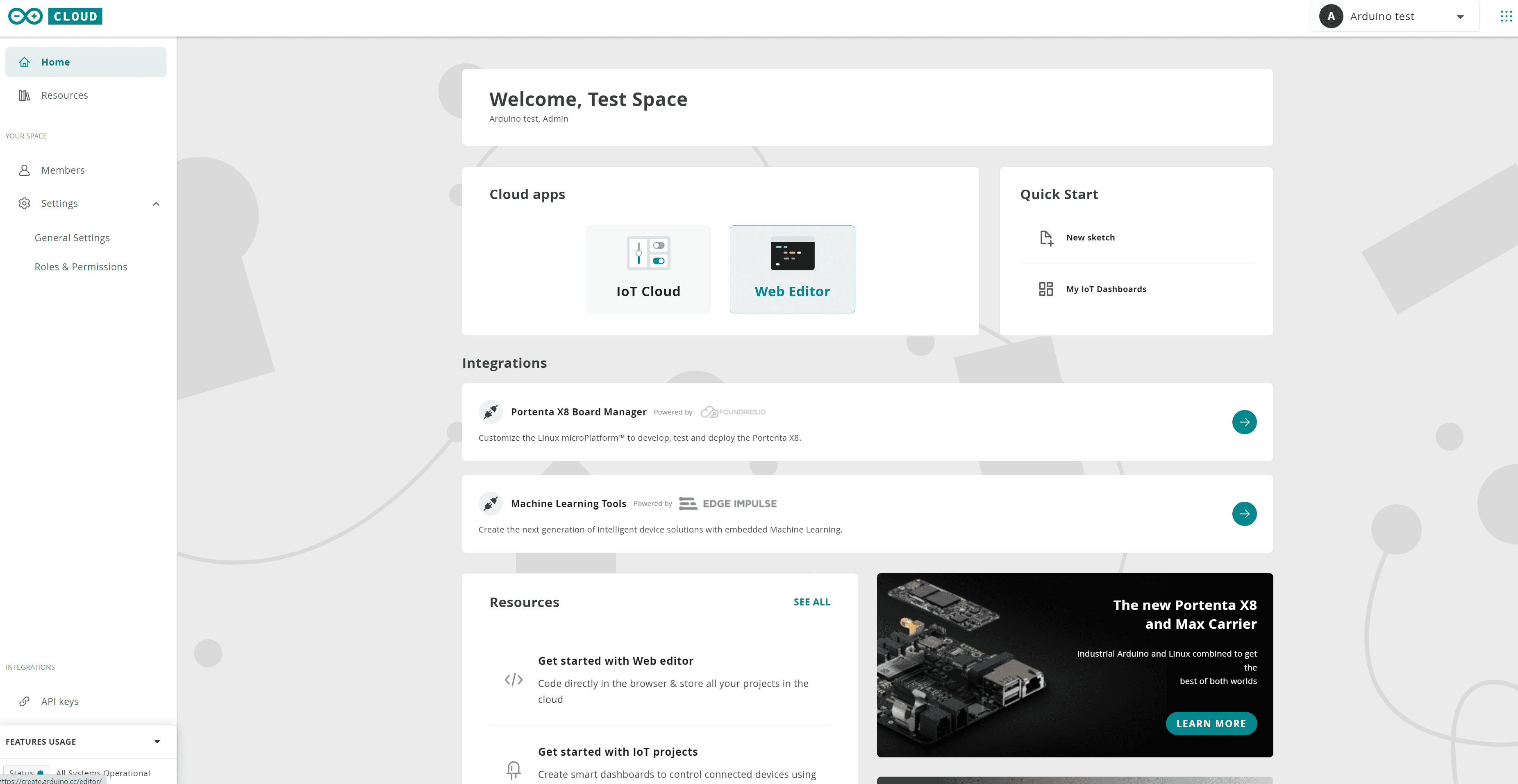 When you are all set up correctly, you can click on Arduino Cloud button in your Shared Space.