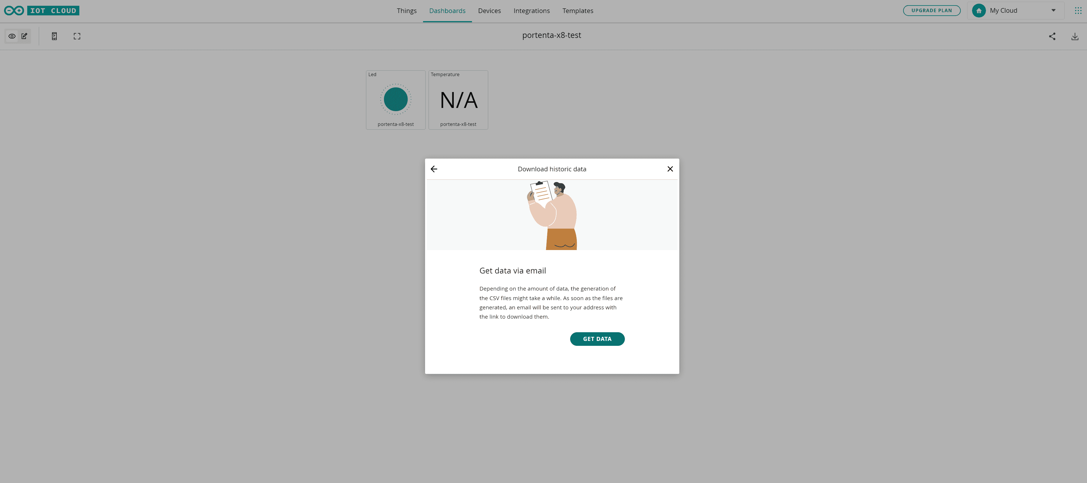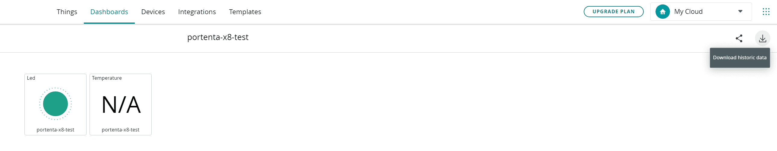 - My Cloud. My Cloud is an automatically created private space once the Arduino Cloud for Business plan is purchased. You can use this space for personal projects you do not want to share with all your team. This space is free and includes two Things, unlimited dashboards, and 100MB of Sketch storage by default, but it can be further extended and customized within My plans settings. Have a look at the Arduino IT Cloud Getting Started if you would like to start using your private space.