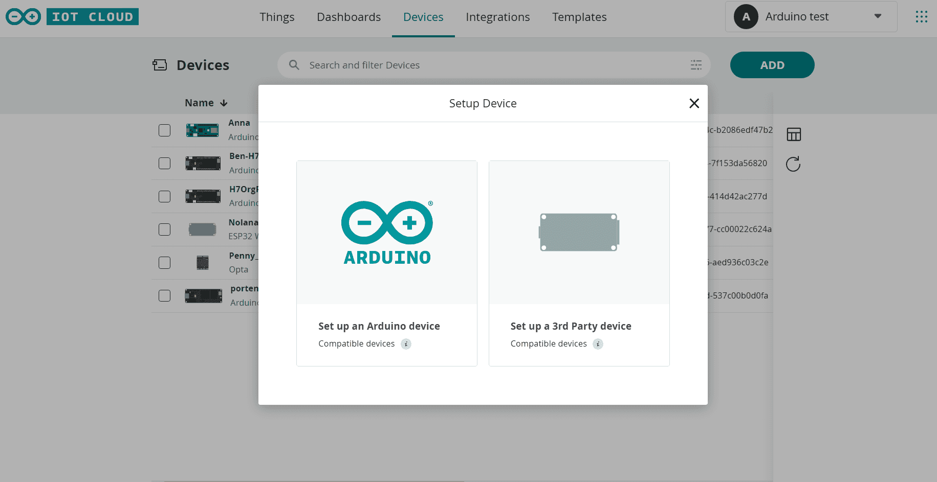 Go to the Devices tab, click on Add and decide which type of device you would like to onboard. In this case, a Portenta H7 board will be used.