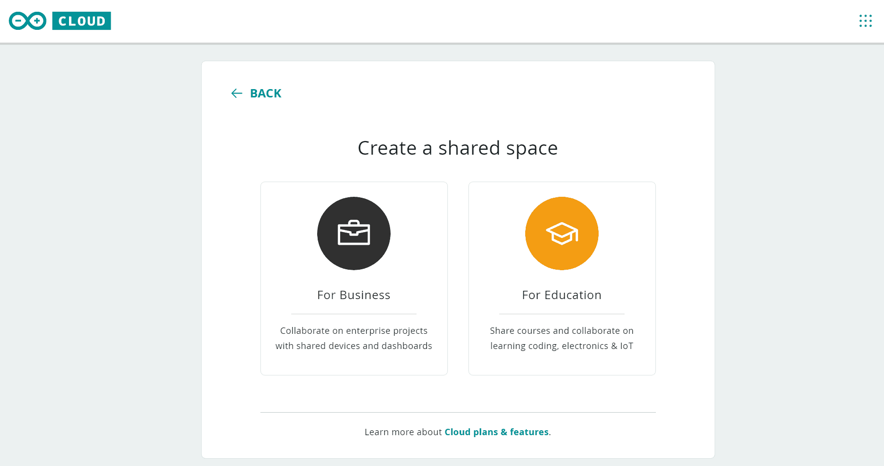 - Enterprise Base Plan. It includes all the Arduino Cloud for Business features, like data plane, fleet management, Role-Based-Access-Control, Web Editor with Over-the-air updates, IoT Cloud with dashboards, etc. Multiples of 50 devices can be connected under the Enterprise Base Plan – and you can always contact our team for a tailored plan to accelerate your IoT solutions.