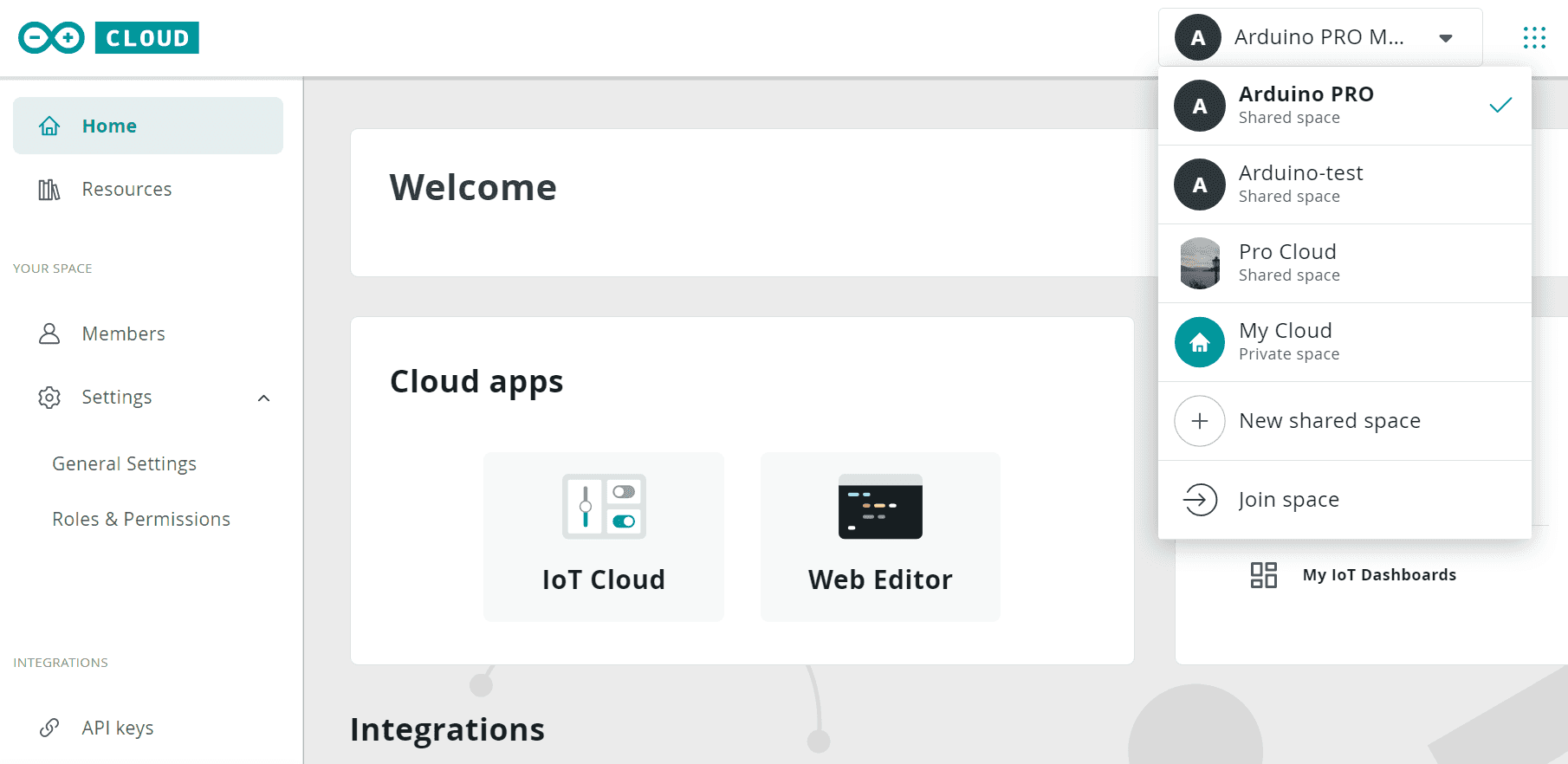 The Space-Selector shows you at any time which Space you are currently working on, in this case, Arduino PRO. To switch to another Space, simply select the Space you would like to work on.
