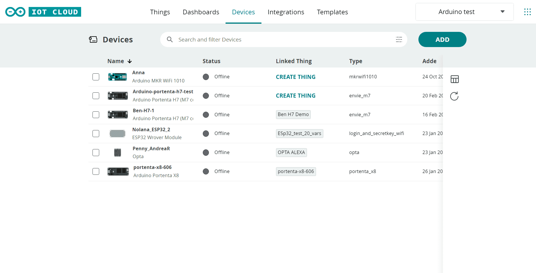 The device status indicates whether it is connected to the Arduino Cloud (online), or not connected (offline).