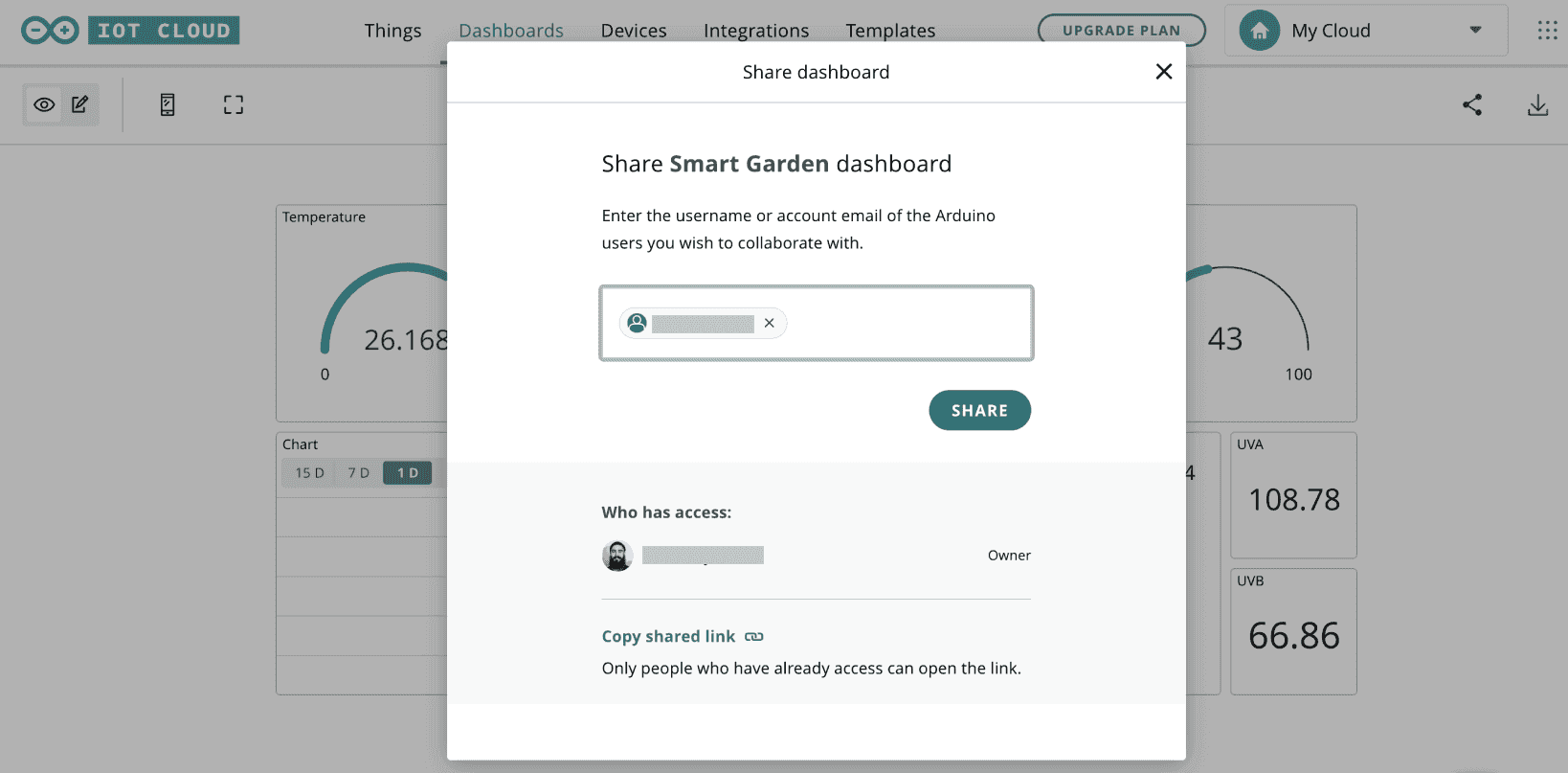 Whether it is your teammate, your customer, or your system integrator; you can freely share your dashboards with all the people you like. Just keep in mind that the interested stakeholders need to have an Arduino Account to access the dashboards.