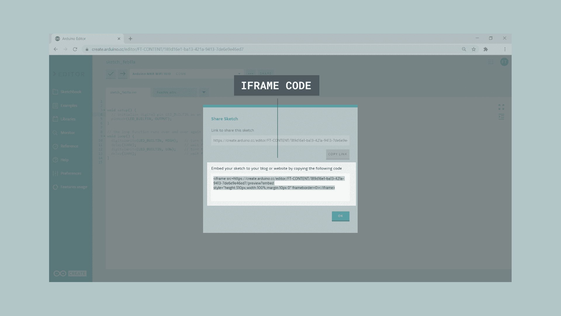Then, we need to have a code. In this tutorial, we are just going to use the good old blink example. When we have our sketch ready, click on the share button next to the port selection tool. This will open up a new window, that will have two fields: link and iframe. Copy the iframe field.