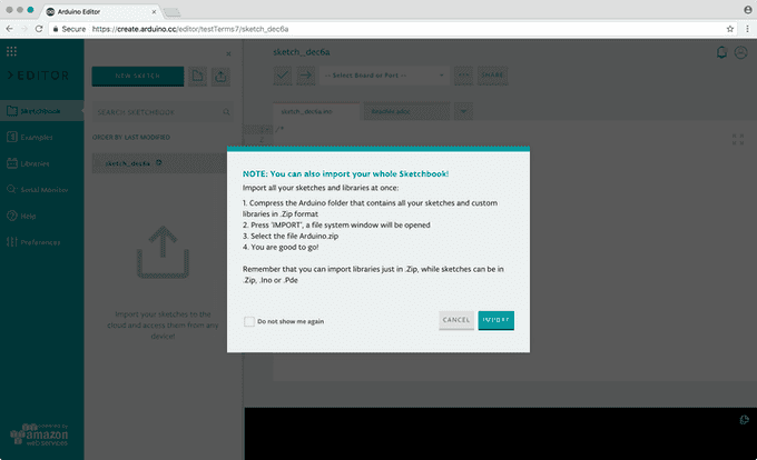 But let’s import your whole sketchbook in a few clicks, so you will be all set up to start using the Arduino Web Editor.