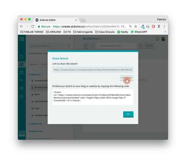 - When done with writing your sketch, click the ‘Share’ button on the toolbar in the editor area. Press 'Copy Link' and you can now share your Arduino code with the rest of the world!