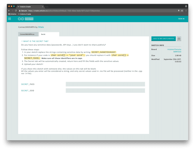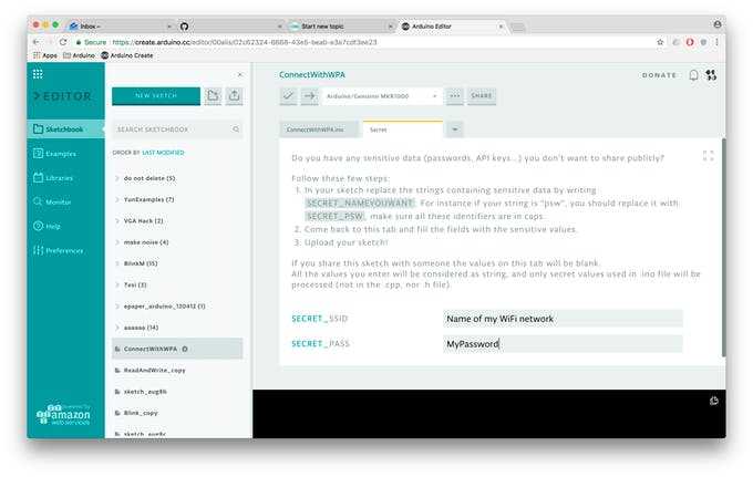 SECRET_SIID and SECRET_PSW. If you now click on the tab called “Secret,” you will notice some input fields where you can fill in your data.If you have a MKR1000 lying around, you can upload this sketch on it and watch your board connect to Internet (just make sure you join a 2GHz WiFi network).