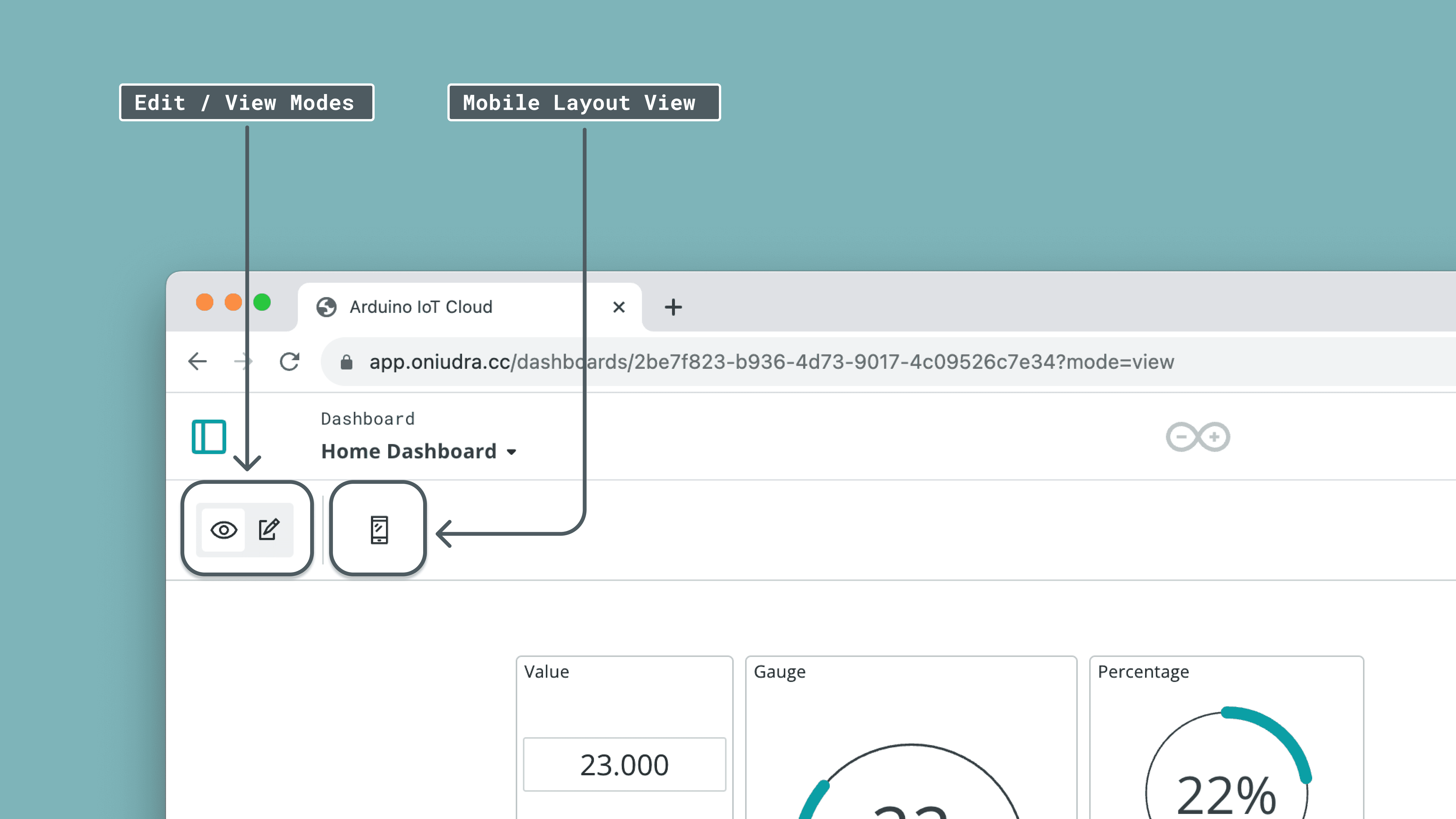 Dashboards in the Arduino Cloud are used to easily monitor & control your Arduino boards from a web interface. Dashboards are not linked to one specific Thing or device, you can control all of them through one single dashboard.