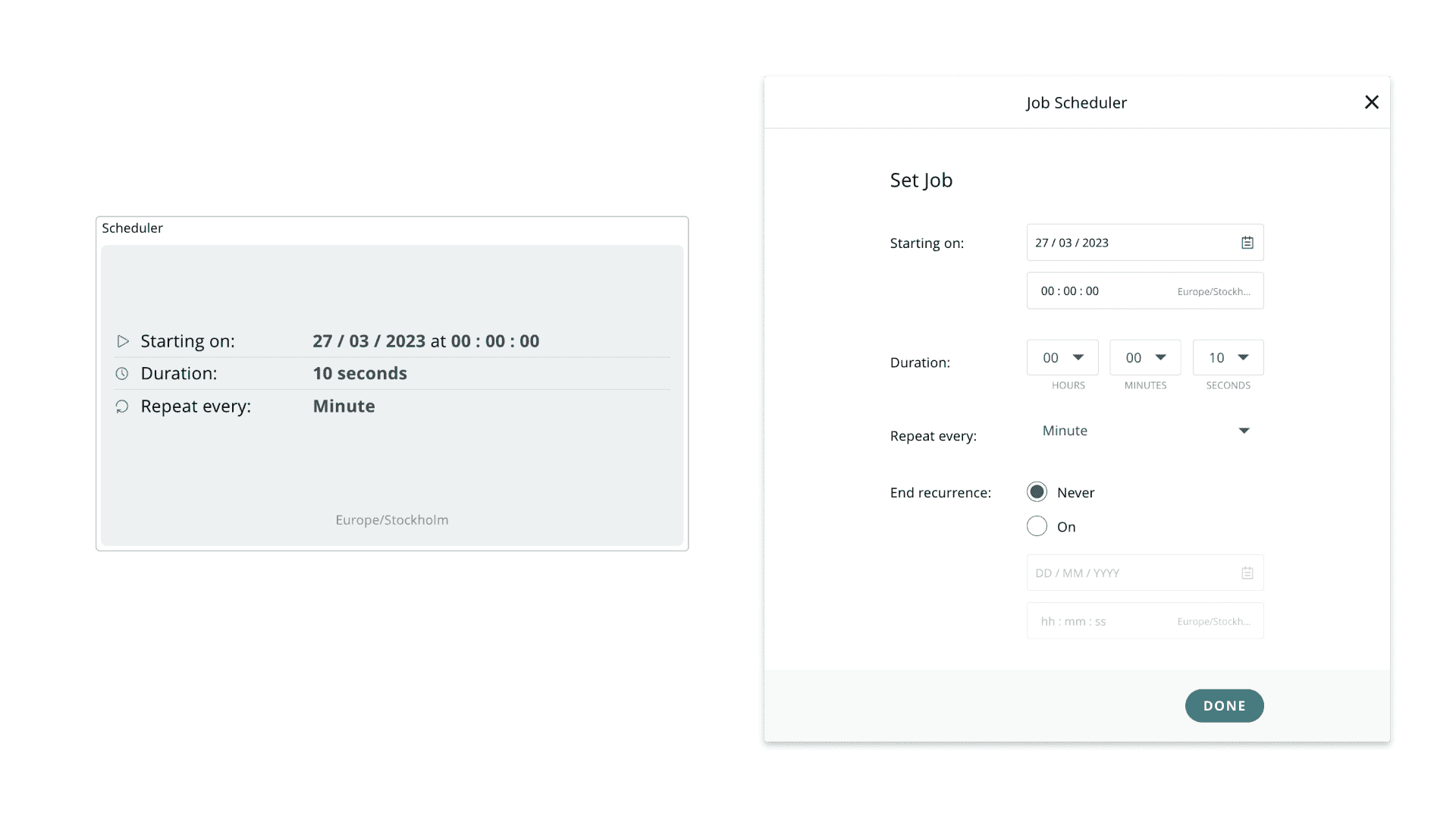 The Scheduler Widget allows you to schedule a job in the future. With this widget, you can schedule: