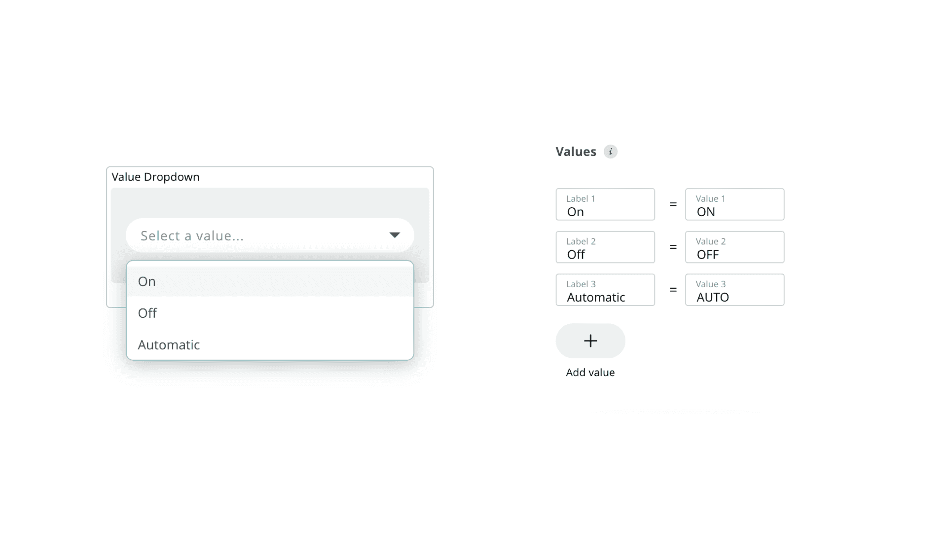 The value dropdown widget works similarly to the value selector and can be used to switch between predetermined values through a dropdown menu. Supported variable types are