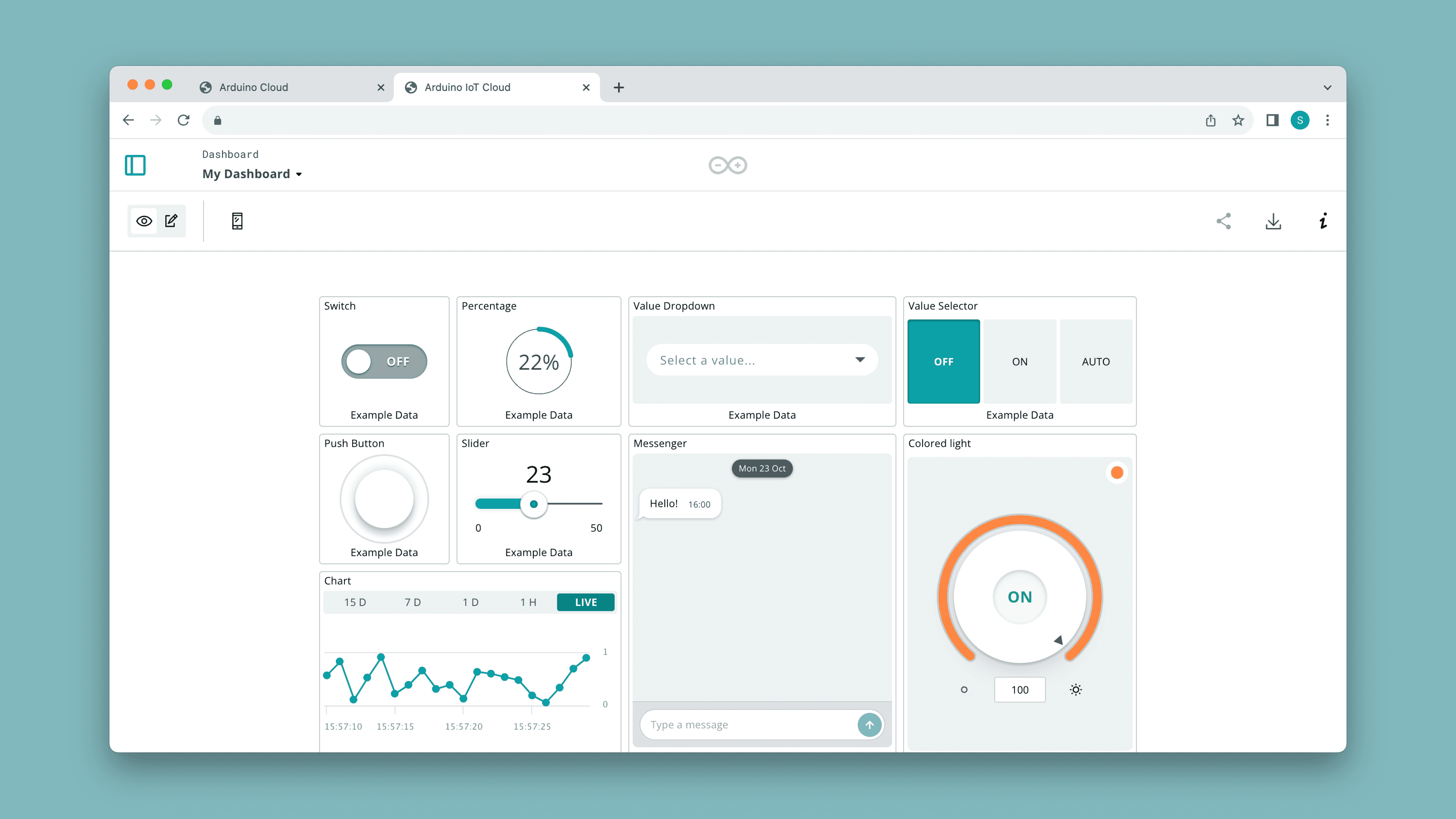 A dashboard consists of one or several widgets that are linked with your Cloud variables. You can for example set up a switch to turn on/off a light, a gauge that displays temperature, or a chart that shows data over time.