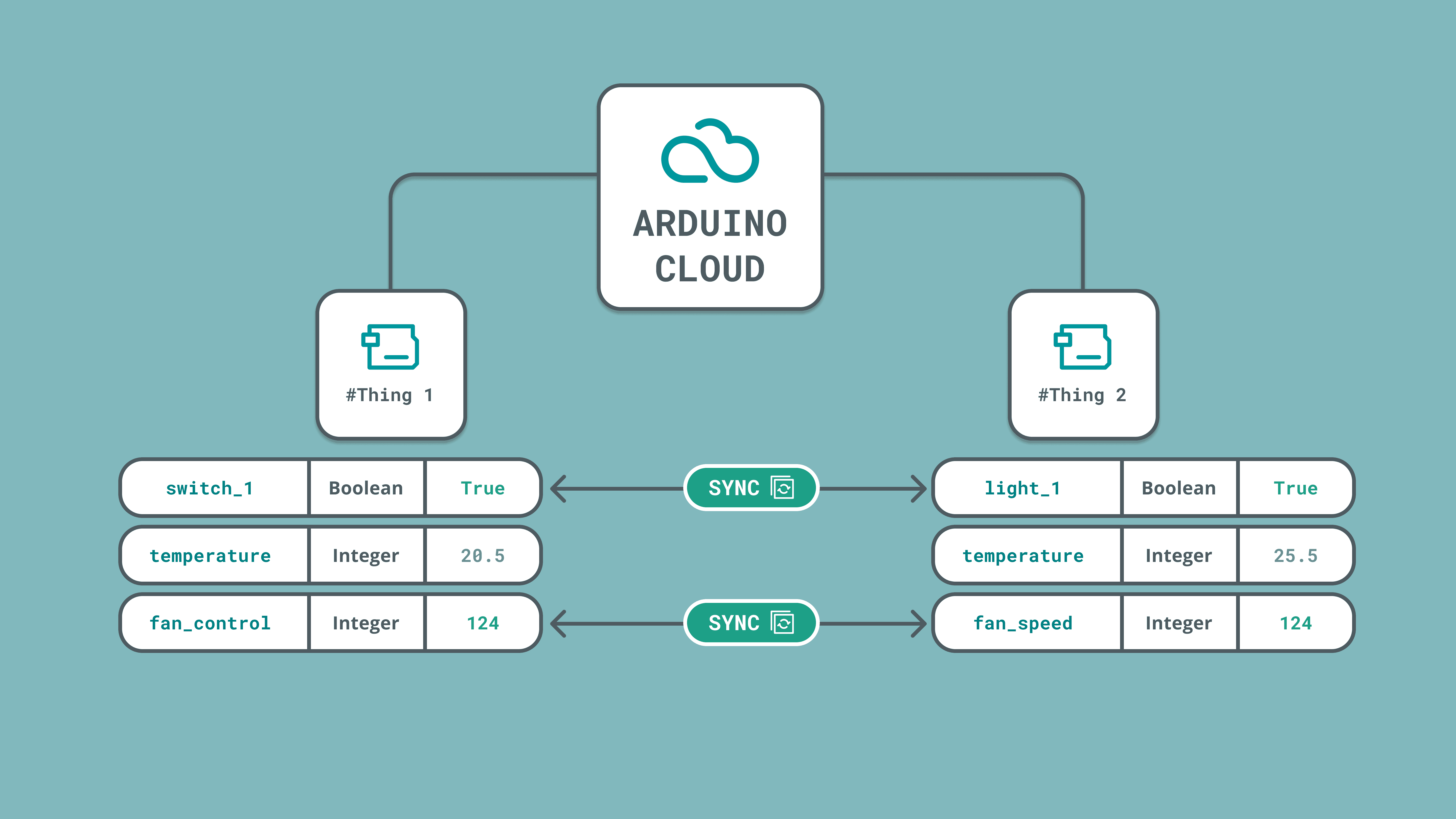 It is possible to sync (link) one or many variables across different Things, a feature that enables bi-directional communication between devices, without writing a single line of code!