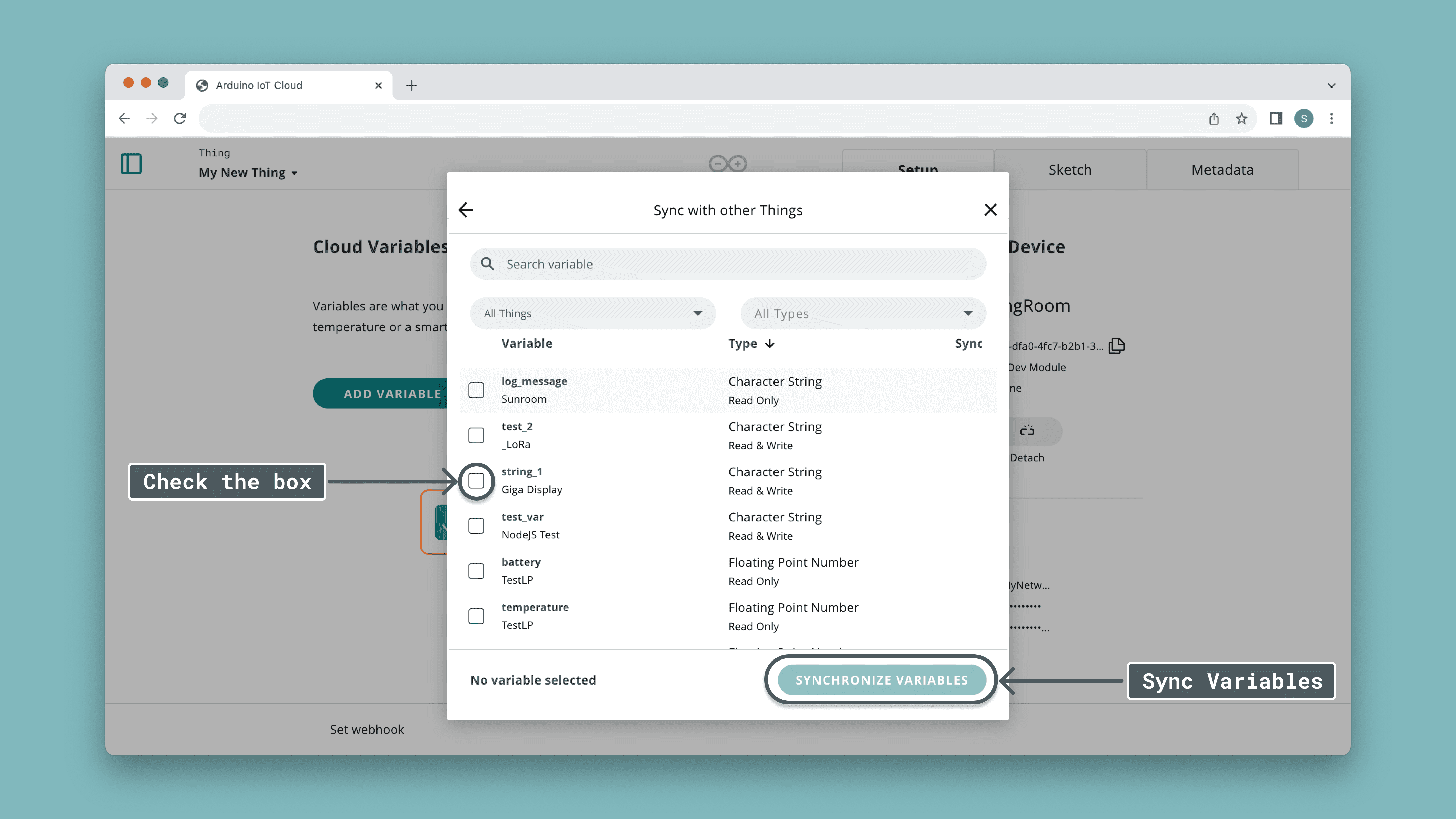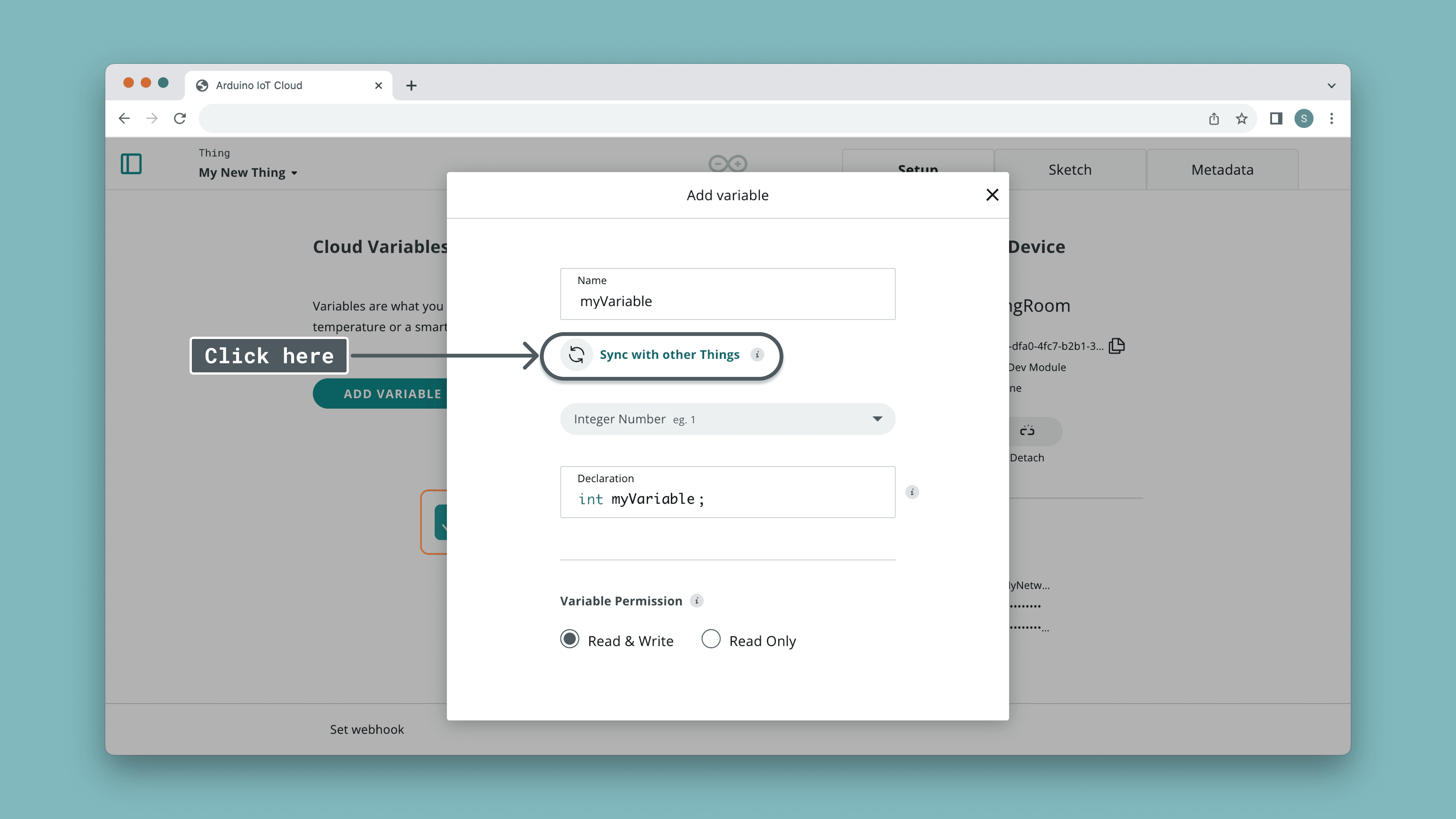 - (optional) Sync With Other Things: sync a variable with a variable from another Thing. Whenever one variable updates, the other will follow.