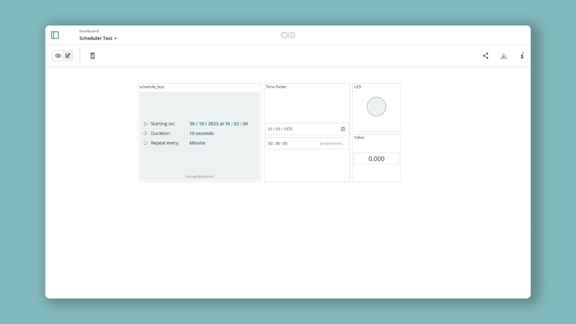light variable to true, whenever the schedule_test variable is true. While it is true, the LED widget, which is linked to the light variable, will be on (for 10 seconds). Each time this happens, the counter variable will also increase by 1.