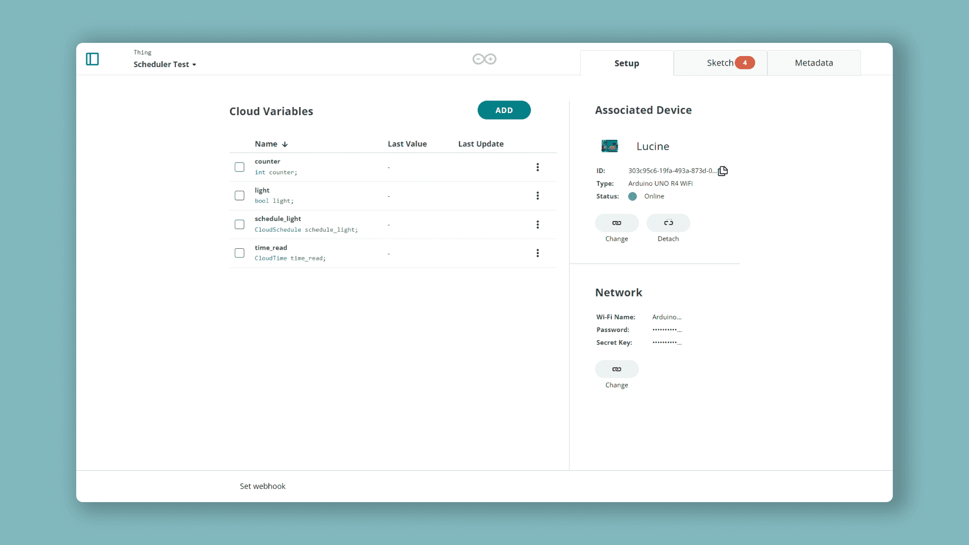 12 ArduinoCloud.begin(ArduinoIoTPreferredConnection);13 setDebugMessageLevel(2);14 ArduinoCloud.printDebugInfo();15 counter = 0;16 light = false;17}18
