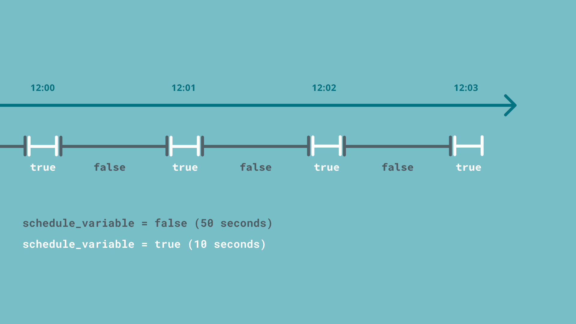 CloudSchedule type can be configured to trigger at a specific time, with a specific duration. In the code, you do not need to worry about the logic for this. The configuration of the variable is done in the dashboard, through a widget associated to the variable.For example, we can set such variable to be: