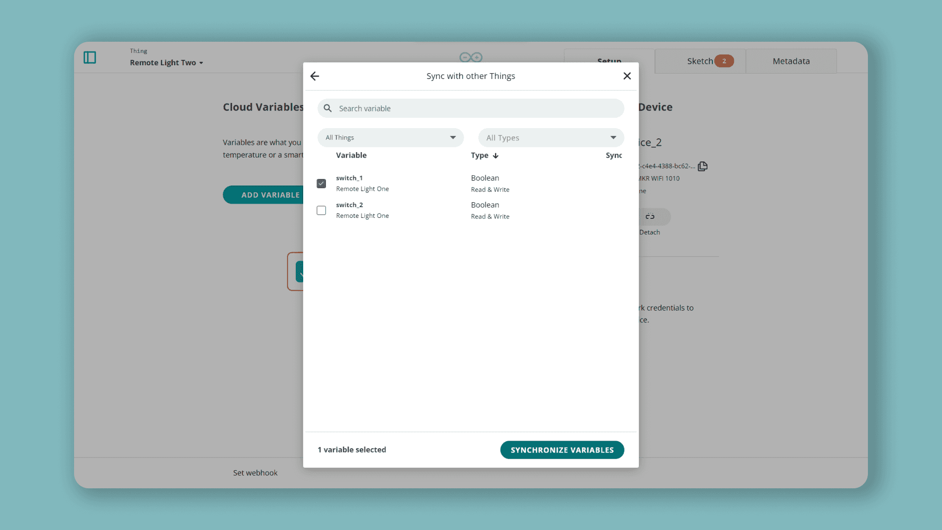 Next, we can repeat the same process for the boolean variable, but instead of selecting the switch_2 variable to sync with, select the boolean_sync variable. Now we should have two variables that are synced with our other Thing.