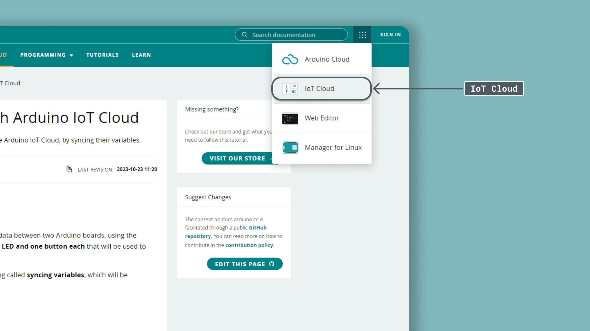 To start, we will need to head over to the Arduino Cloud. This is also accessible through the menu at the top right.