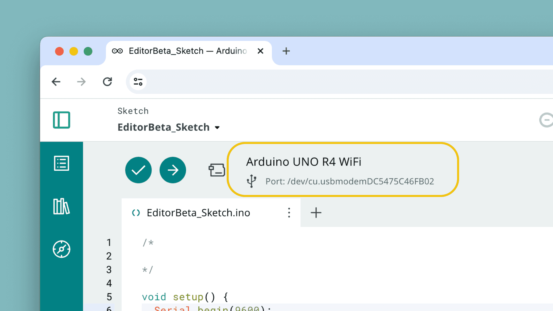 Now connect an Arduino board to your computer. Once you connect it, it should show up in the editor.