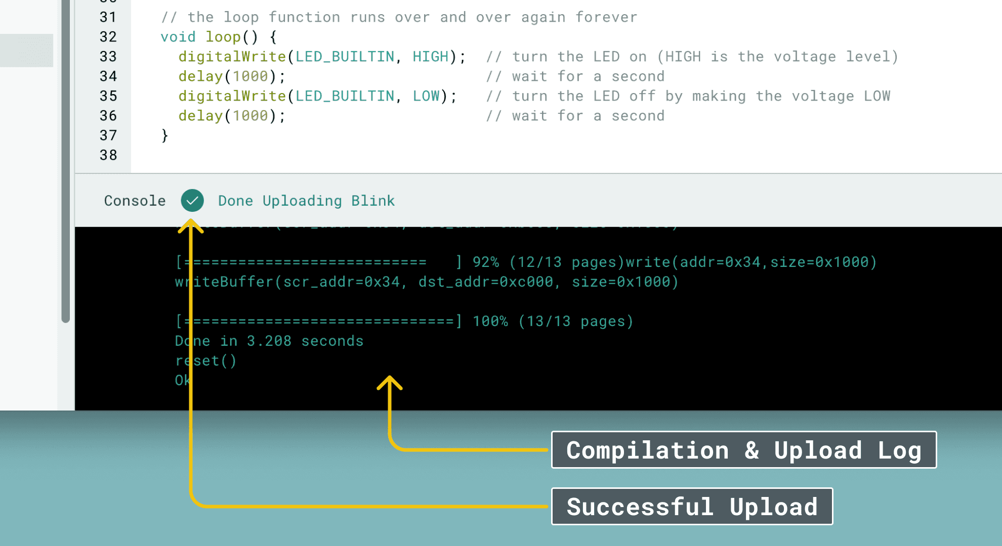 - Console Log - this window informs you of the status of your compilation / upload.
