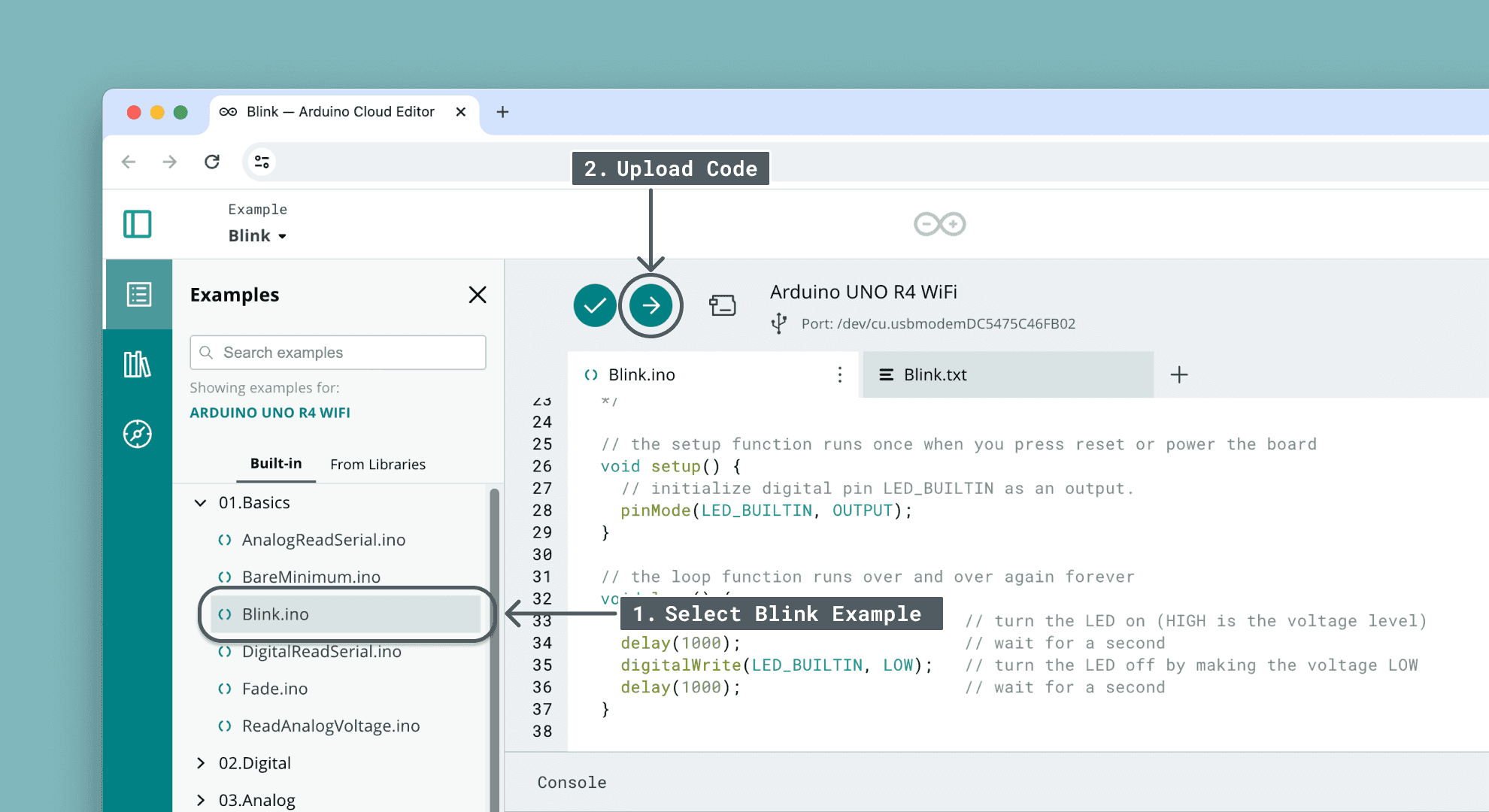 Finally, let's upload a sketch to your board. Click on the "Examples" icon, and navigate to 01.Basics > Blink. Clicking the example will open a new window. Once open, click on the "Upload" button, and make sure to not disconnect your board during this process.