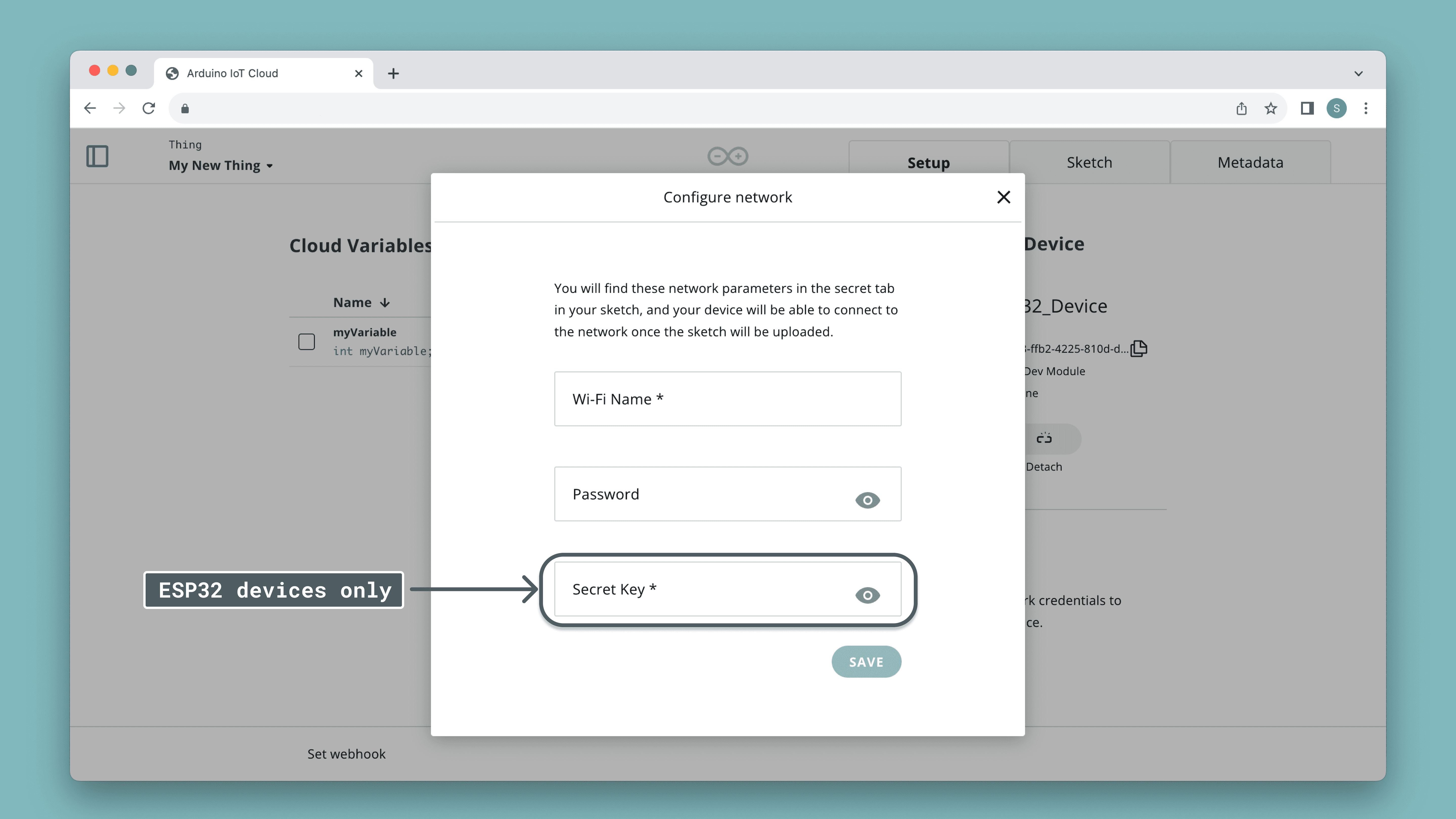 Setting up ESP based boards in the Arduino Cloud is quick and simple. It is done by generating a Device ID and Secret Key, which together with your Wi-Fi® credentials is enough to connect to the Arduino Cloud.