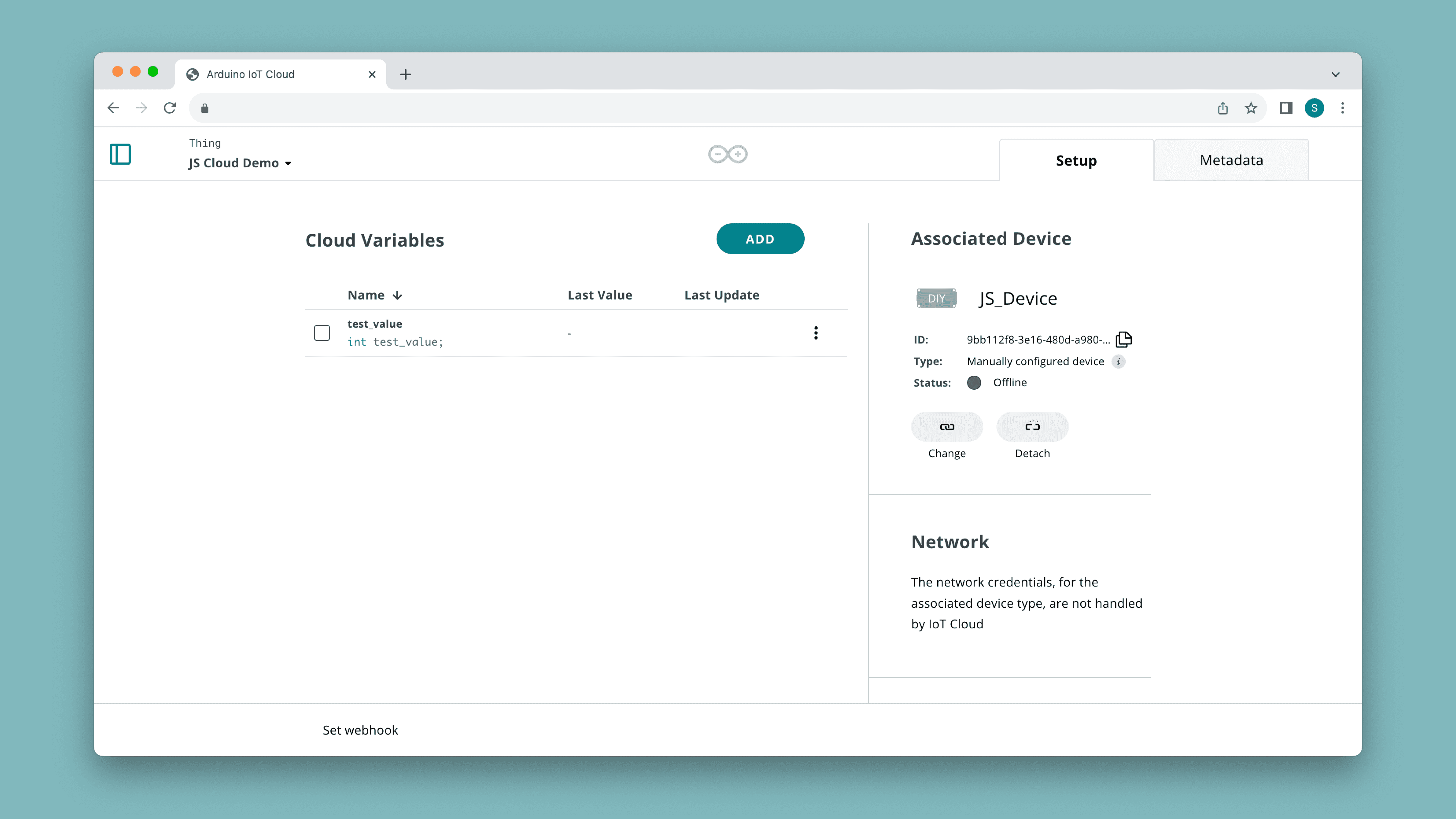 test_value to 20), and awaits any changes from the Cloud. You can ensure it is working by checking your Thing interface as well:You can test out the