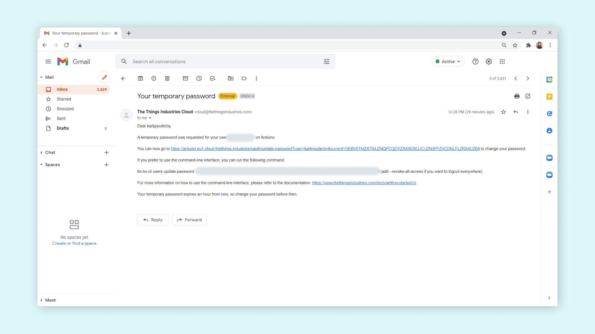1. After your device is successfully configured, an email is sent to your account's email address, and an account is automatically created on The Things Stack Network. The email includes a link to creating a password for that account, which you will need to follow to complete the registration.