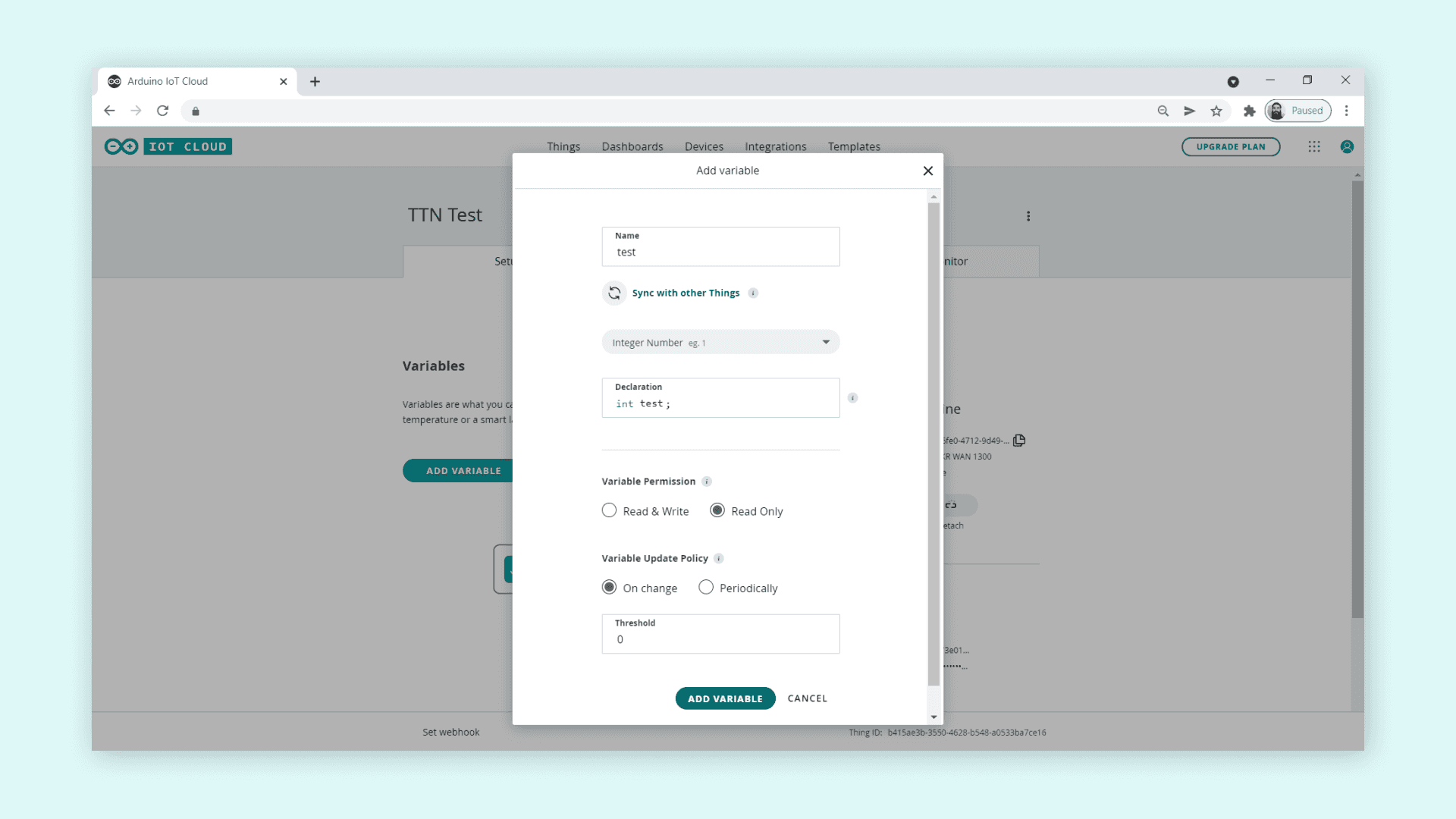 test, and select Integer Number as data type (this will be declared as int test;). Tick the Read Only option, and click on "Add Variable.3. Let's head to the Sketch tab, where you can use the following code: