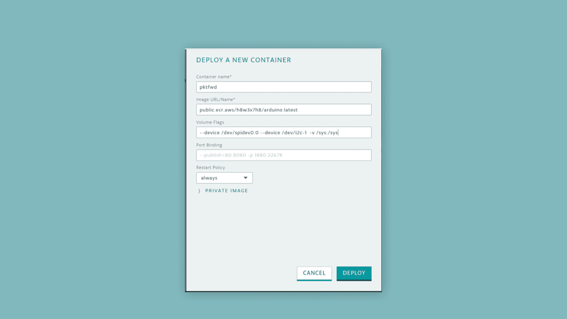 (use this exact name).pktfwd - Image URL: public.ecr.aws/h8w3x7h8/arduino:latest