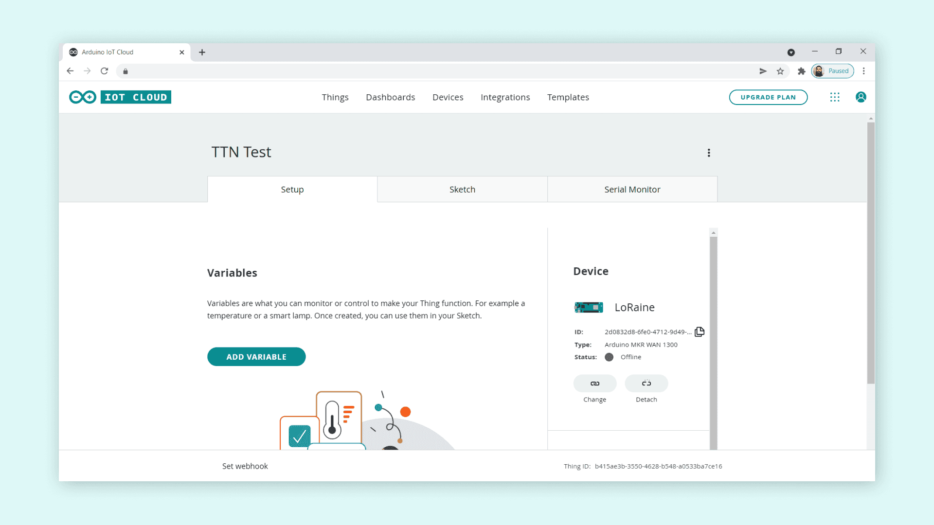 1. After TTS registration is complete, head back to the Arduino Cloud, and to the Thing you created earlier. Here, we will need to click on the "Add Variable" button, following the image below: