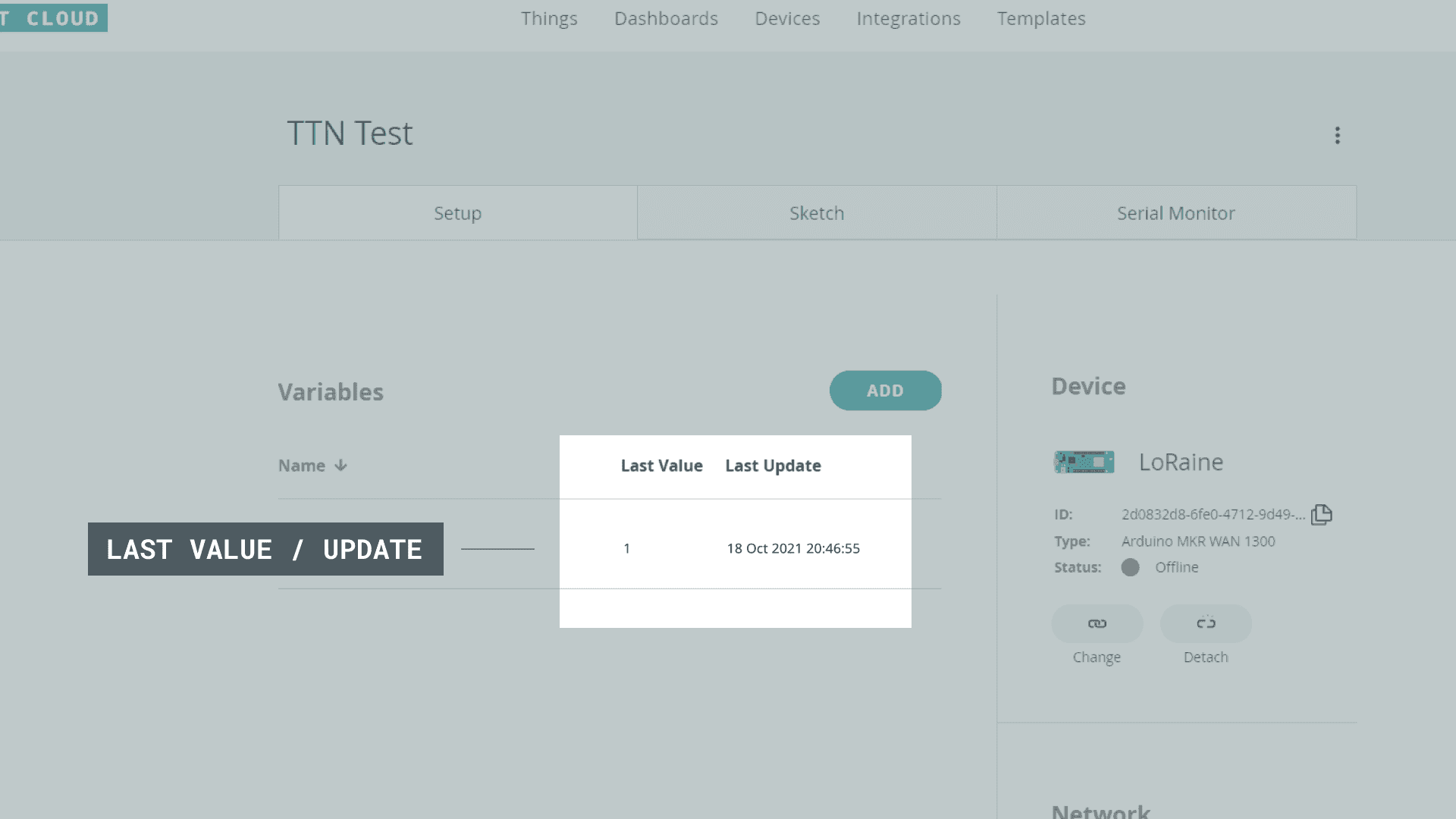 In this step, we will complete the Arduino Cloud setup that we started earlier by configuring a device. We will create a simple test variable, that we will use to send data from the MKR WAN 1300/1310 device. This will just be a counter that updates 3 minutes, to see if the data can be successfully sent from the end device to the Arduino Cloud via the The Things Network.