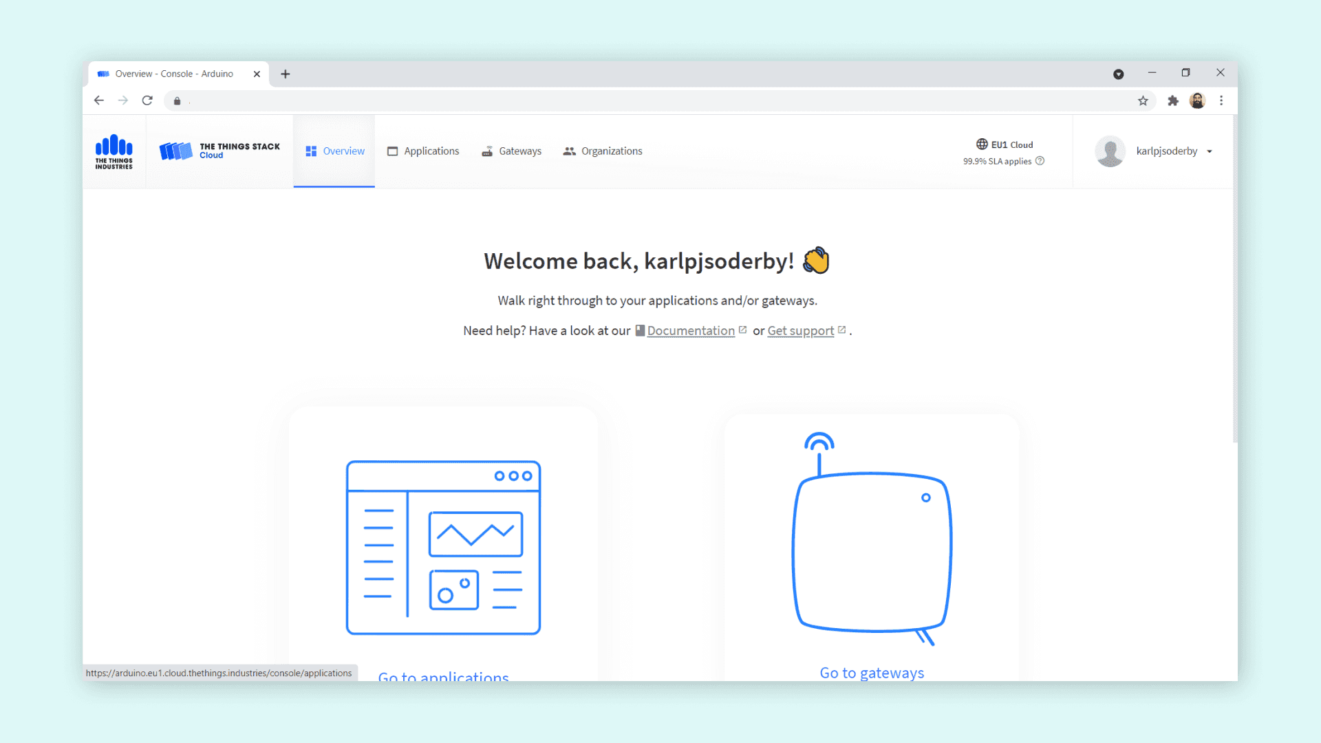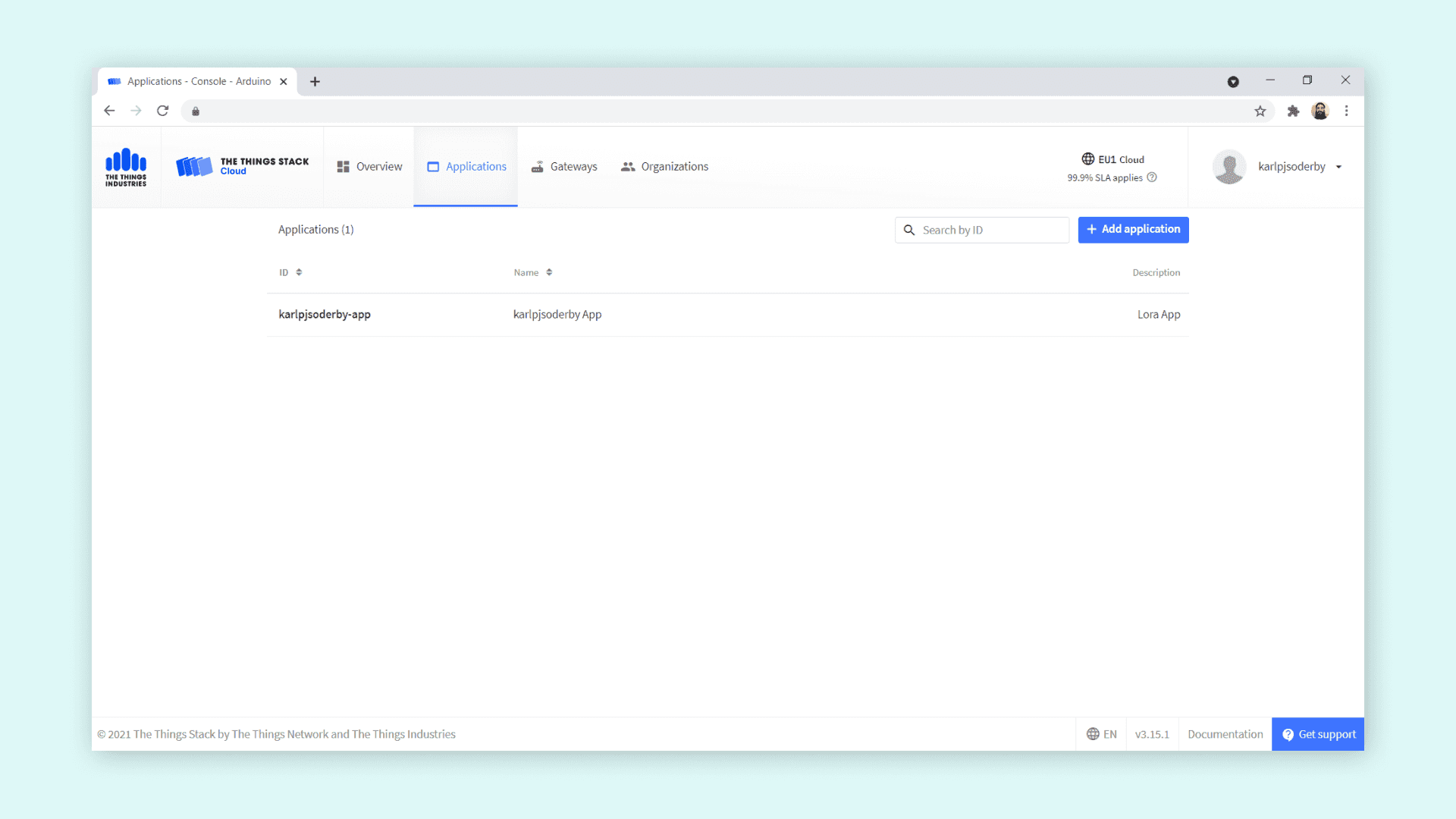 [username]-app item from the list.8. You are now in the application overview. Here you will find a lot of useful information, such as DevEUI, AppEUI & AppKey, and see the live data that is sent to and from your device. You do not need to make any changes here, but it acts as a great troubleshooting tool to check if your device is working.
