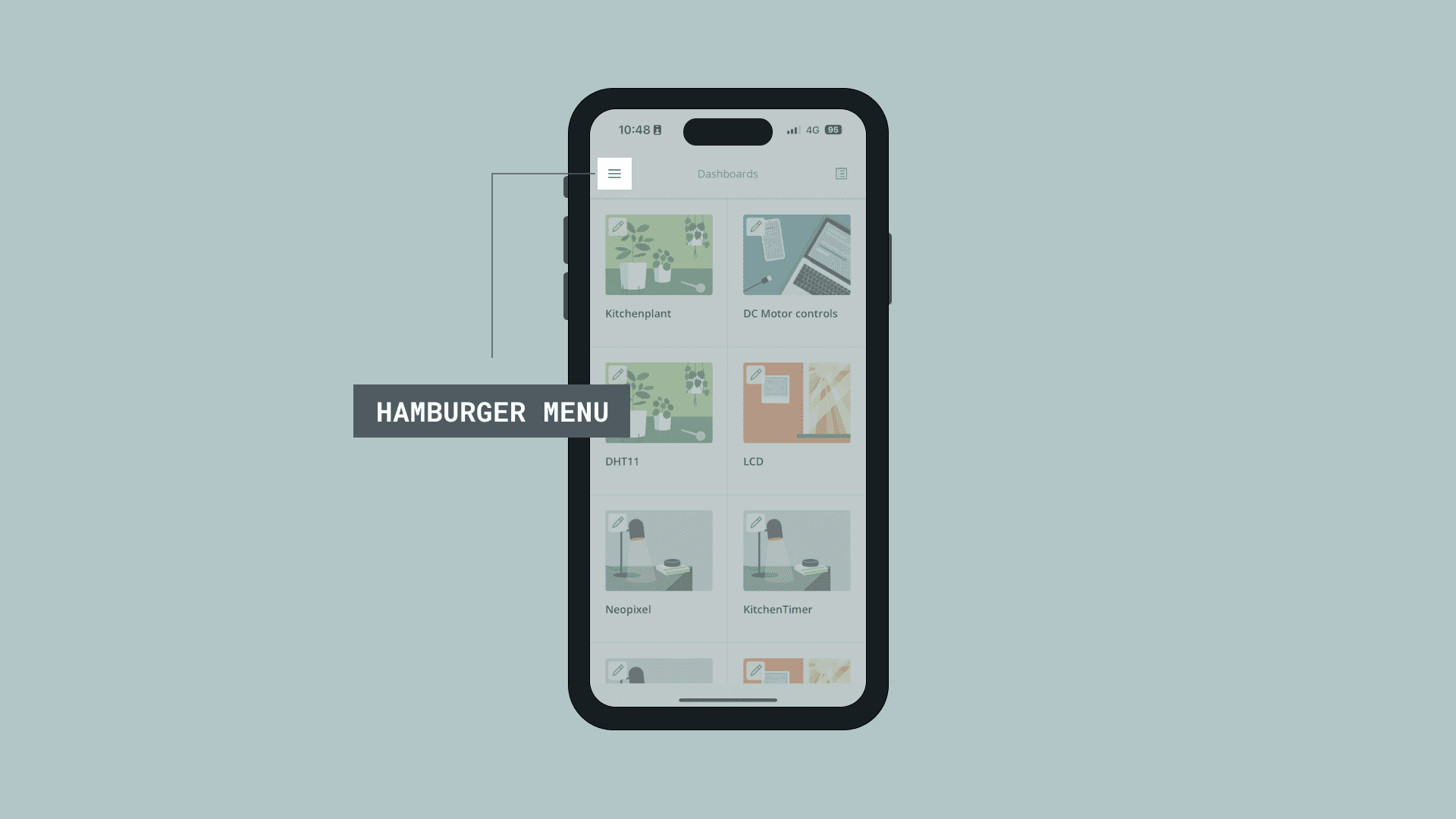 Once you have the app installed, open it and log into your Arduino Cloud account. At this point you should be presented with a list of all your previous dashboards if you have any.