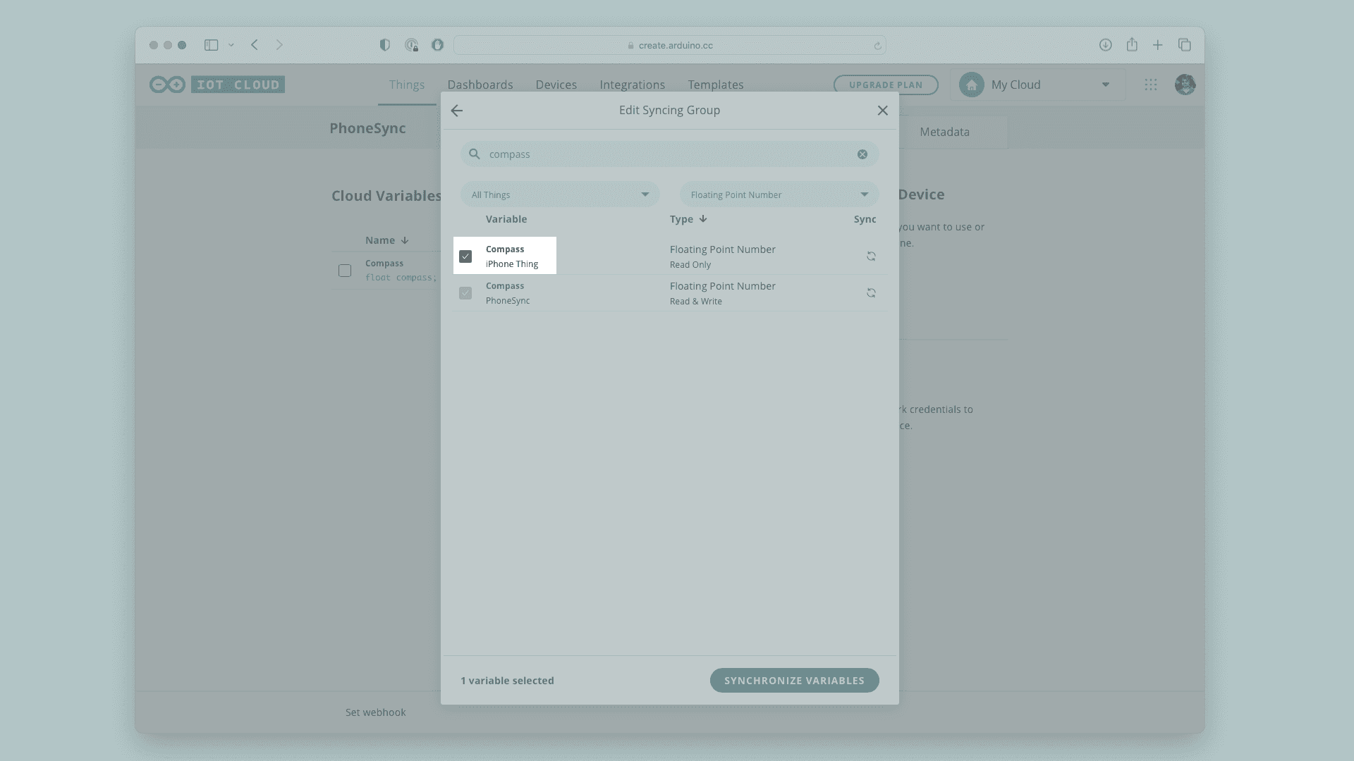 Name the variable something appropriate, "Compass" for example. Click the "Sync with other Things" button to open up the syncing menu, search for "compass" and make sure to tick the box of the compass variable tied to your mobile devices Thing.