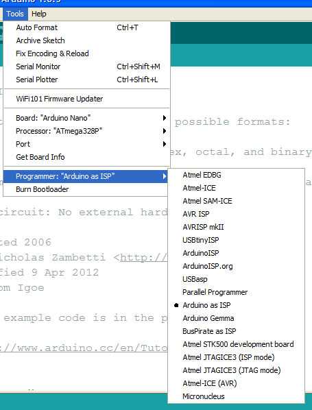 The Arduino that you will use as programmer needs a specific sketch. You find it under Examples > 11. ArduinoISP > ArduinoISP .