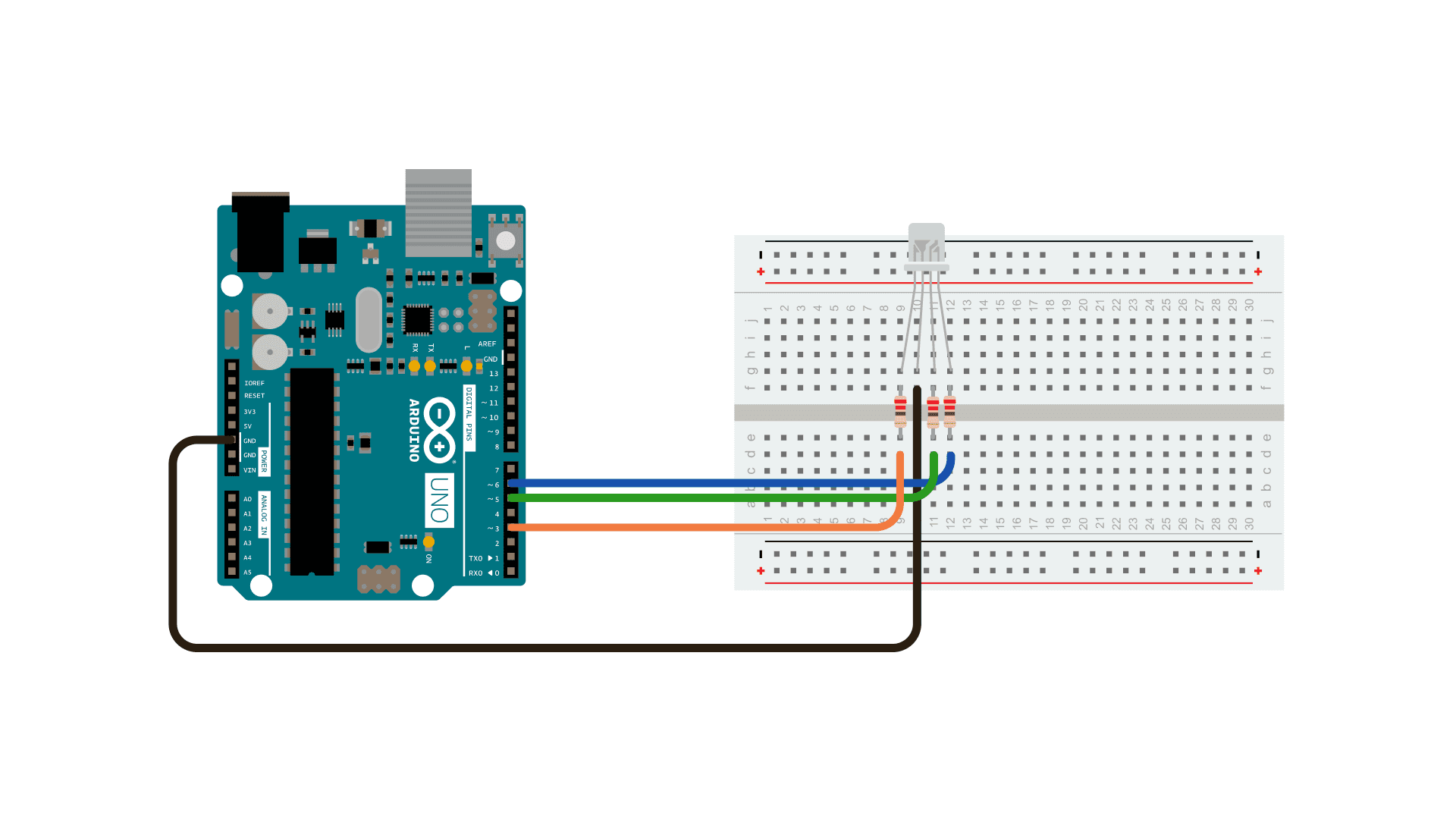 1const int redPin = 3;2const int greenPin = 5;3const int bluePin = 6;In your setup(), begin serial communication at 9600 bits of data per second between the board and your computer with the line: