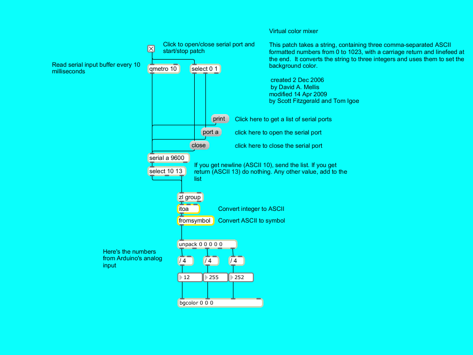 This example demonstrates how to send multiple values from the Arduino board to the computer. The readings from three potentiometers are used to set the red, green, and blue components of the background color of a Processing sketch or Max/MSP patch.