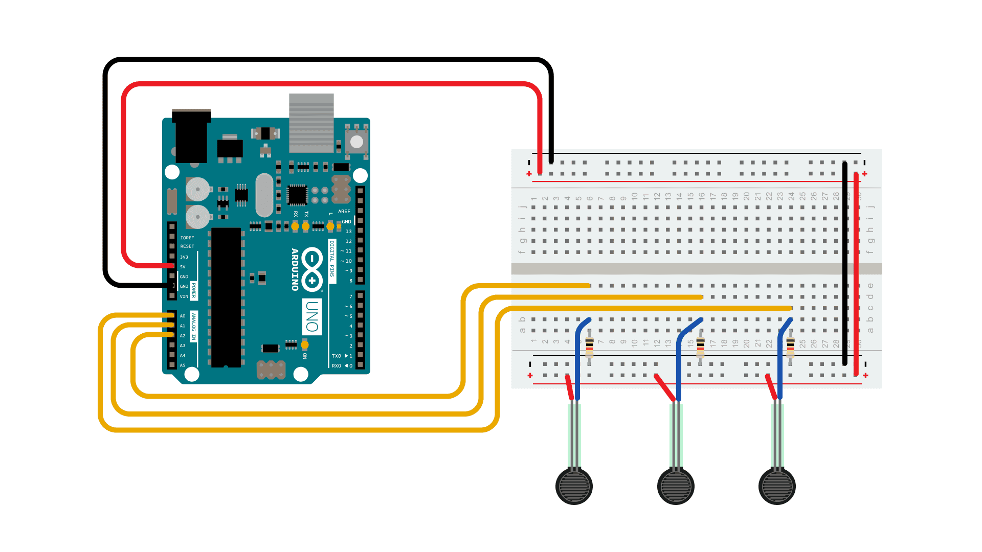 This circuit uses three voltage divider sub-circuits to generate analog voltages from the force-sensing resistors. a voltage divider has two resistors in series, dividing the voltage proportionally to their values.