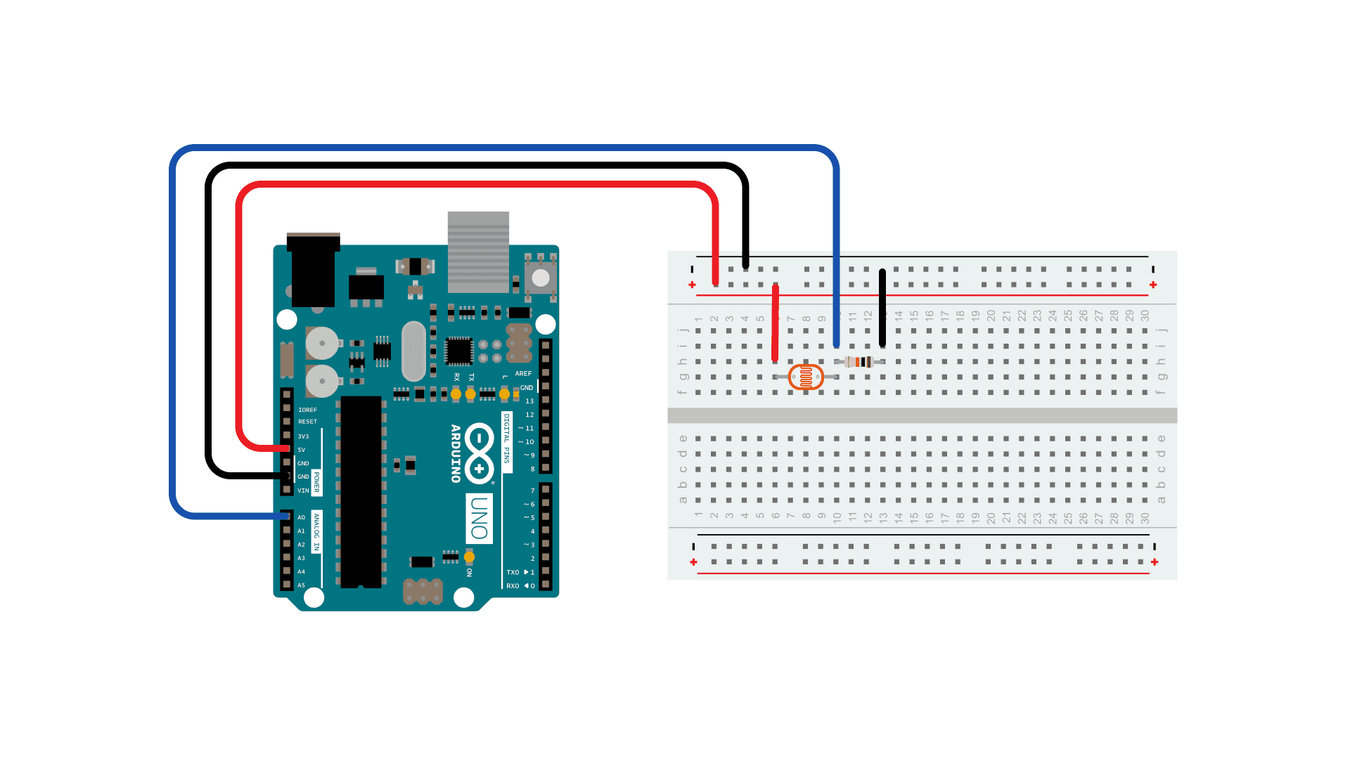 The photoresistor is connected to analog in pin 0 using a voltage divider circuit. A 10K ohm resistor makes up the other side of the voltage divider, running from Analog in 0 to ground. The