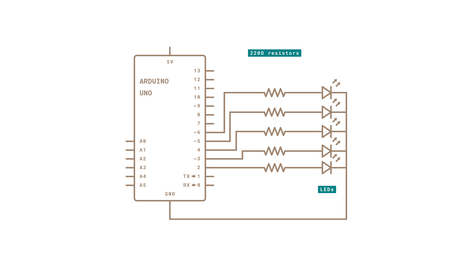 Five LEDs are attached to digital pins 2, 3, 4, 5, and 6 in series through 220 ohm resistors.