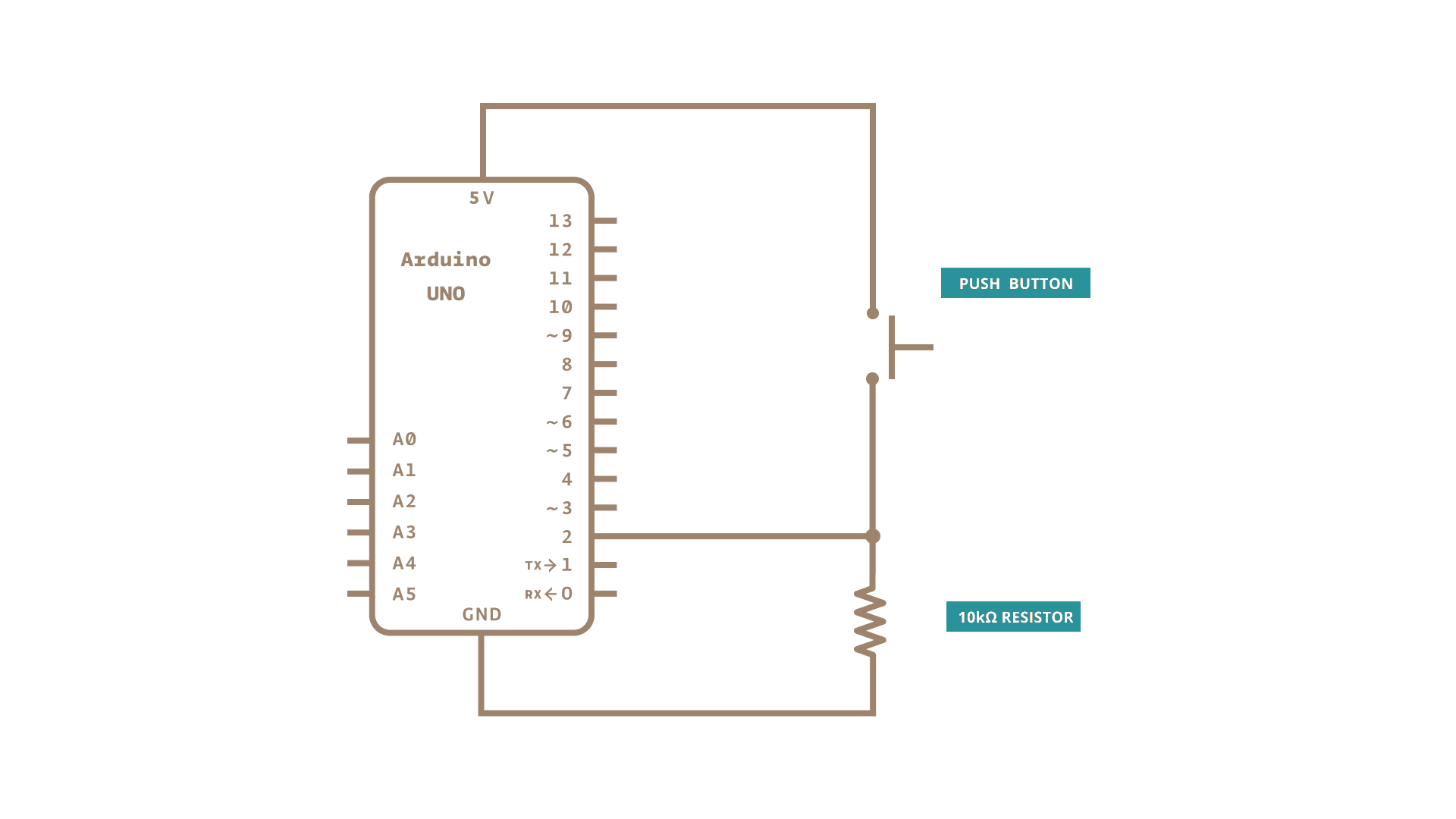 Connect three wires to the board. The first goes from one leg of the pushbutton through a pull-down resistor (here 10k ohm) to ground. The second goes from the corresponding leg of the pushbutton to the 5 volt supply. The third connects to a digital I/O pin (here pin 2) which reads the button's state.
