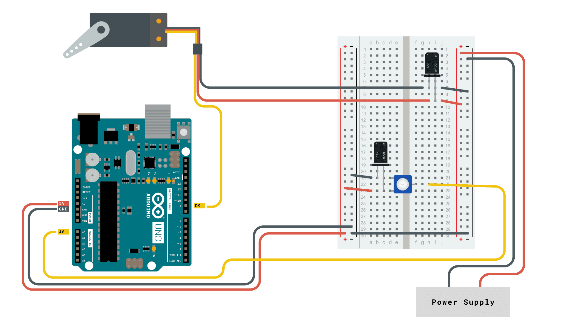 12void loop() {13 val = analogRead(potpin); // reads the value of the potentiometer (value between 0 and 1023)14 val = map(val, 0, 1023, 0, 180); // scale it to use it with the servo (value between 0 and 180)15 myservo.write(val); // sets the servo position according to the scaled value16 delay(15); // waits for the servo to get there17}Sweep
